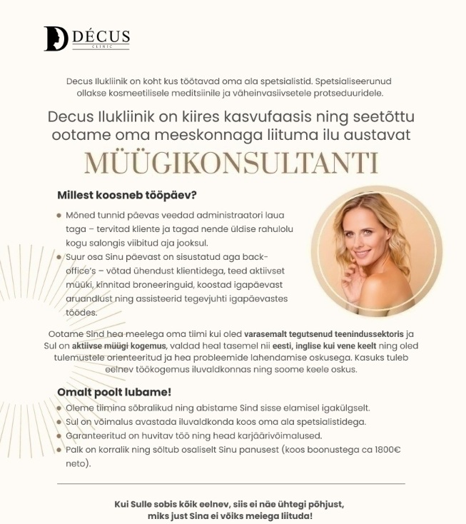 Decus Ilukliinik on iluprotseduuridele keskenduv elustiili kliinik, mis on mõeldud nii meestele kui ka naistele. Decus kliinik spetsialiseerub kosmeetilisele meditsiinile ja võimalikult väheste torgetega ravile plast-kosmeetika operatsioonide valdkonnas. Meie professionaalsel meeskonnal on aastatepikkused kogemused igas vanuses meeste ja naiste ravimises, arvestades iga kliendi erisoove.