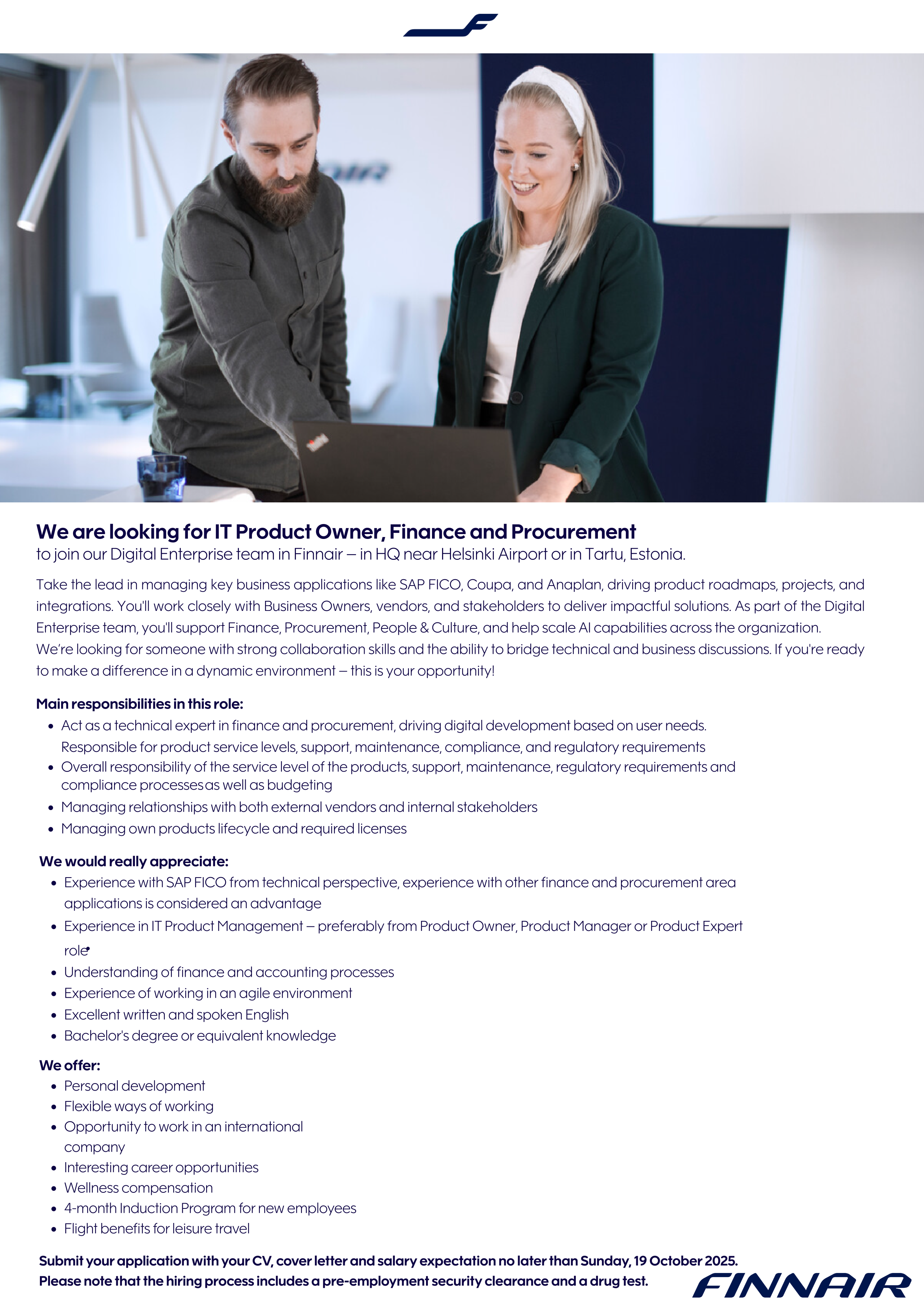 Finnair Business Services is a versatile and ambitious team of over two hundred professionals from different areas - finance, commercial, IT and more. We value simplicity, courage, commitment to care and working together. We offer personal development, interesting career opportunities in unique aviation industry, coherent approach to wellbeing and flexible ways of working.