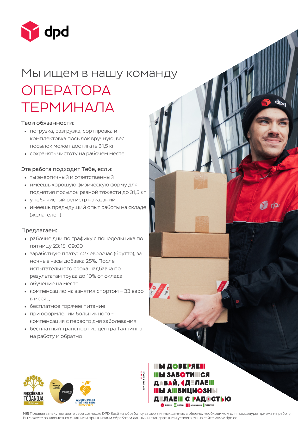 Tööandjana väärtustame DPD Eesti iseseisvaid ja vastutusvõimelisi töötajaid, kellele meeldib pidevalt muutuv ja tempokas keskkond. Kõik meie töötajad esindavad meie põhiväärtust ehk Teeme ära! suhtumist.
