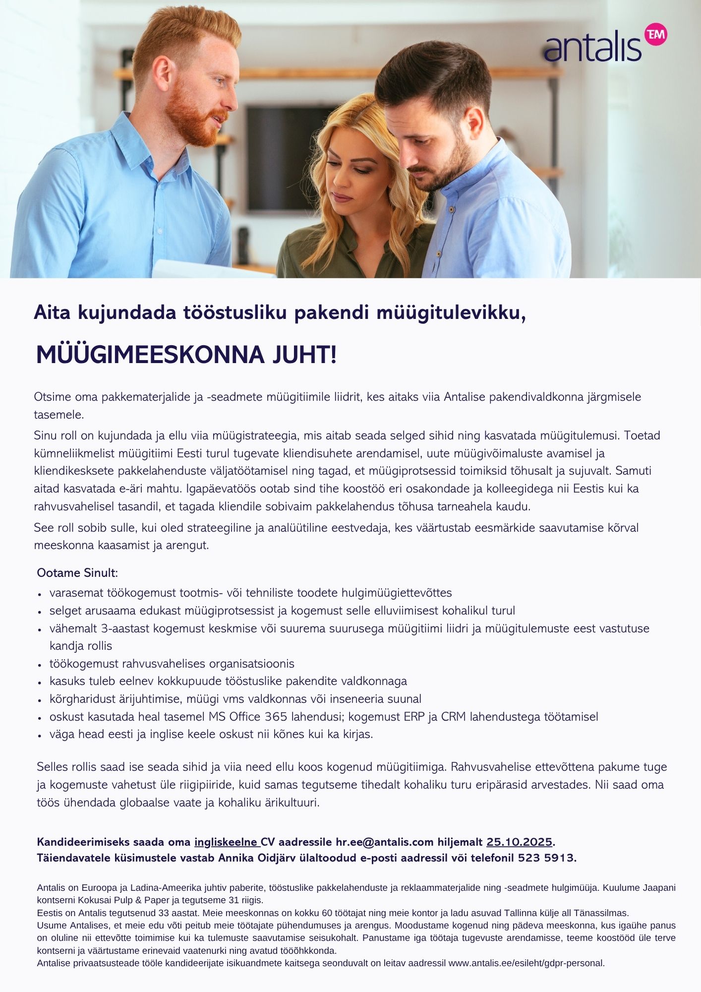 Antalis on Euroopa ja Ladina-Ameerika juhtiv paberite, tööstuslike pakkelahenduste ja reklaammaterjalide ning -seadmete hulgimüüja. Kuulume Jaapani kontserni Kokusai Pulp & Paper ja tegutseme 31 riigis. Eestis on Antalis tegutsenud 33 aastat. Meie meeskonnas on kokku 60 töötajat ning meie kontor ja ladu asuvad Tallinna külje all Tänassilmas.