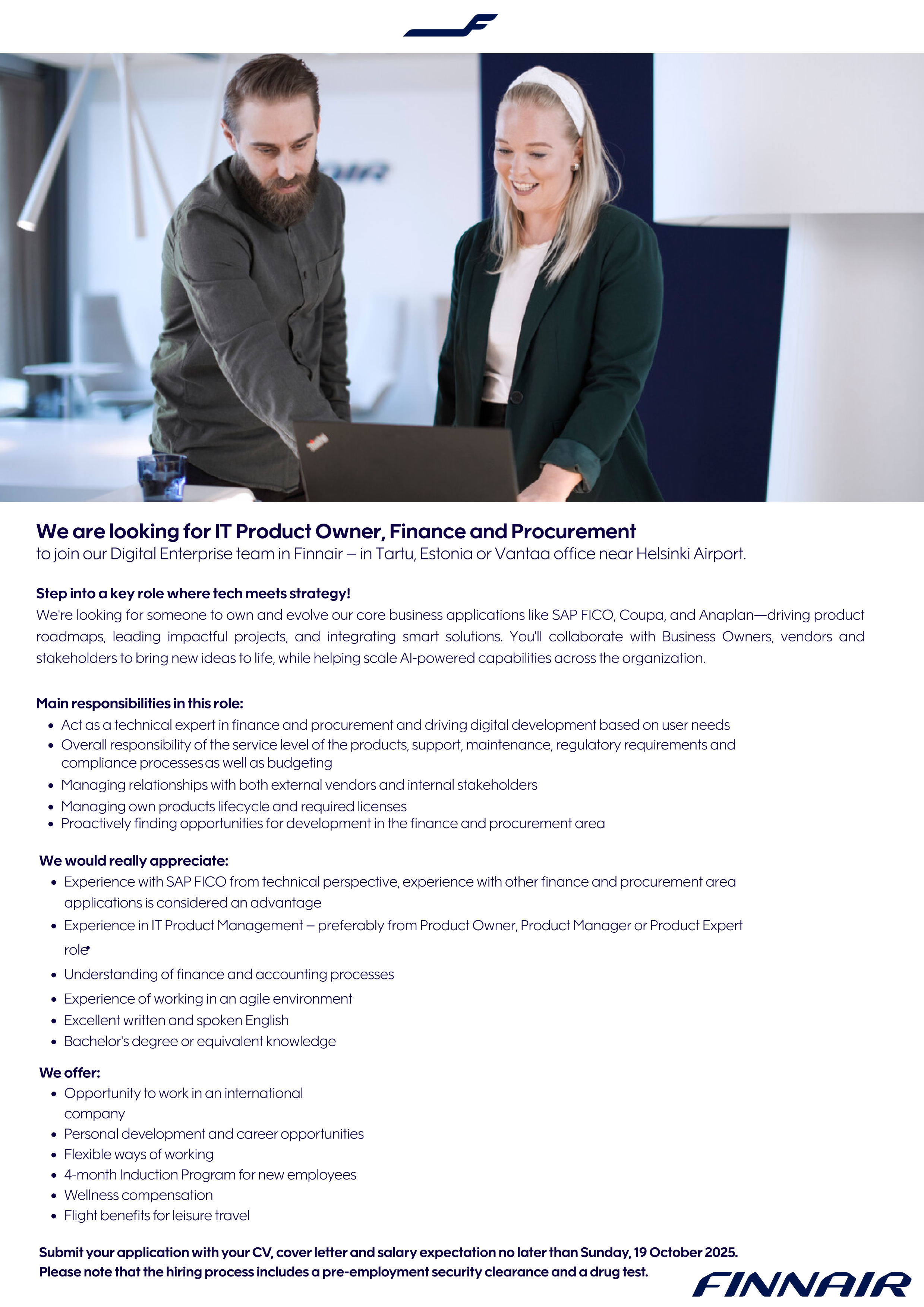 Finnair Business Services is a versatile and ambitious team of over two hundred professionals from different areas - finance, commercial, IT and more. We value simplicity, courage, commitment to care and working together. We offer personal development, interesting career opportunities in unique aviation industry, coherent approach to wellbeing and flexible ways of working.