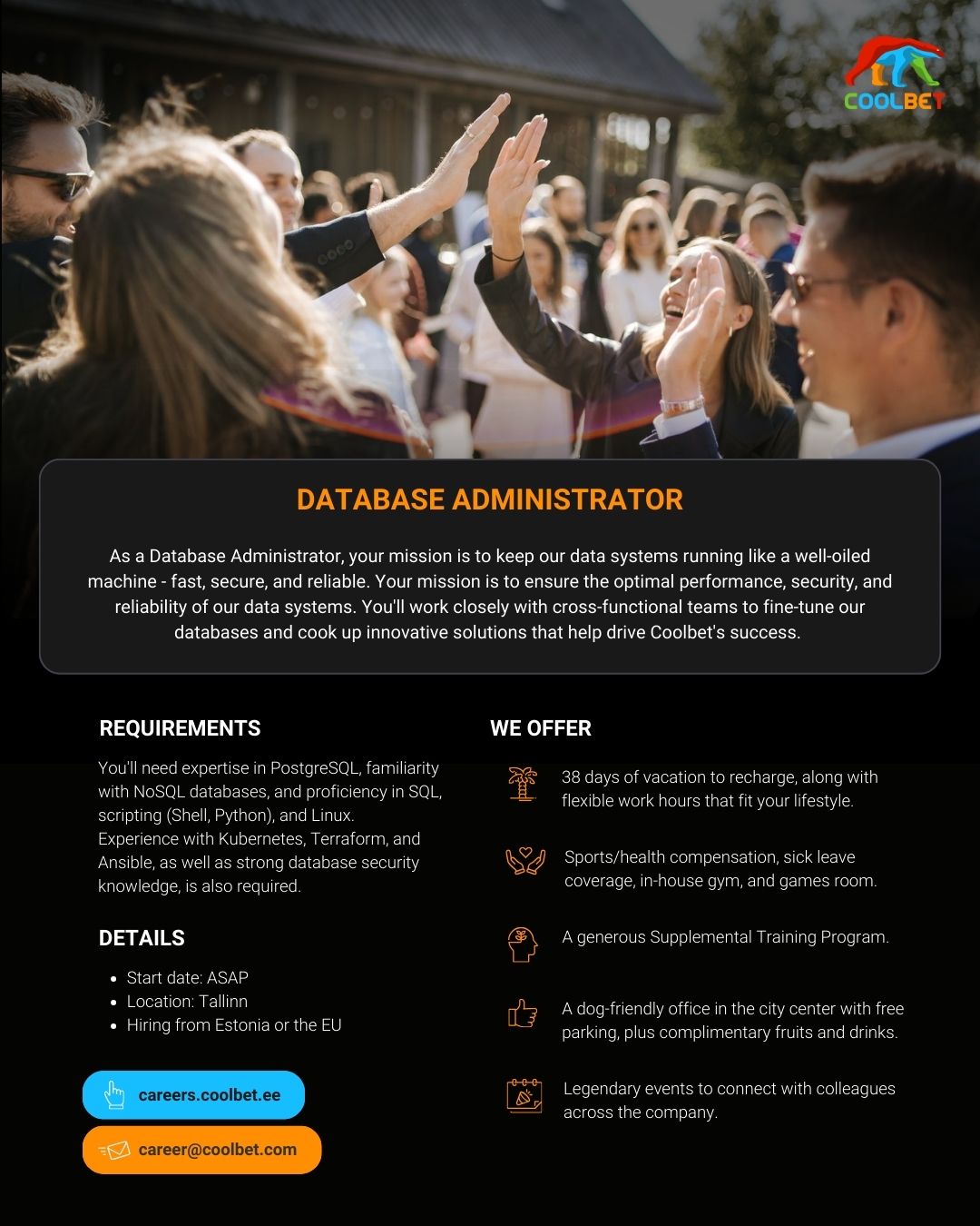 As a Database Administrator, your mission is to keep our data systems running like a well-oiled machine - fast, secure, and reliable. Your mission is to ensure the optimal performance, security, and reliability of our data systems. You'll work closely with cross-functional teams to fine-tune our databases and cook up innovative solutions that help drive Coolbet's success.