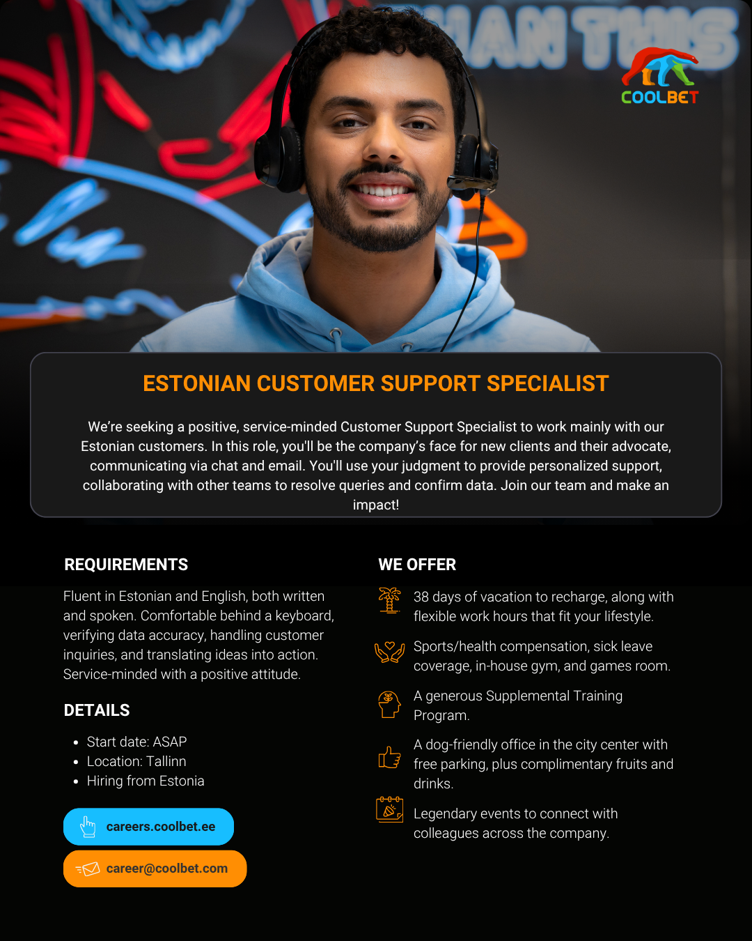 Are you tired of working for a company that's as exciting as watching paint dry and you want to try something new? Look no further! Join Coolbet, the innovative iGaming company that's taking the world by storm! With a diverse team of 1100+, including around 300 based at our vibrant Tallinn HQ, representing more than 50 nationalities, were shaping the future of gaming through continuous product development, a collaborative culture, and a strong commitment to responsible play.