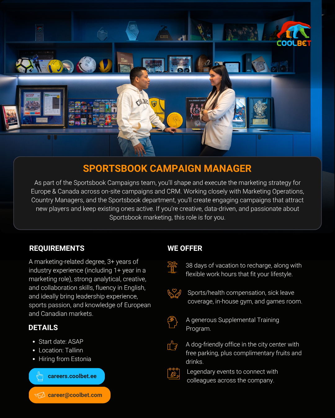 As a key member of the Sportsbook Campaigns team, you'll be responsible for shaping the marketing strategy for Sportsbook campaigns in Europe & Canada and ensuring it's execution across all relevant channels, including on-site campaigns and CRM. You'll work closely with the Head of Marketing Operations, Project Managers, Country Managers, and the Sportsbook department to create engaging campaigns that attract new players and keep existing ones active and entertained. If you are creative, data-driven, and passionate about Sportsbook marketing, this is the role for you.