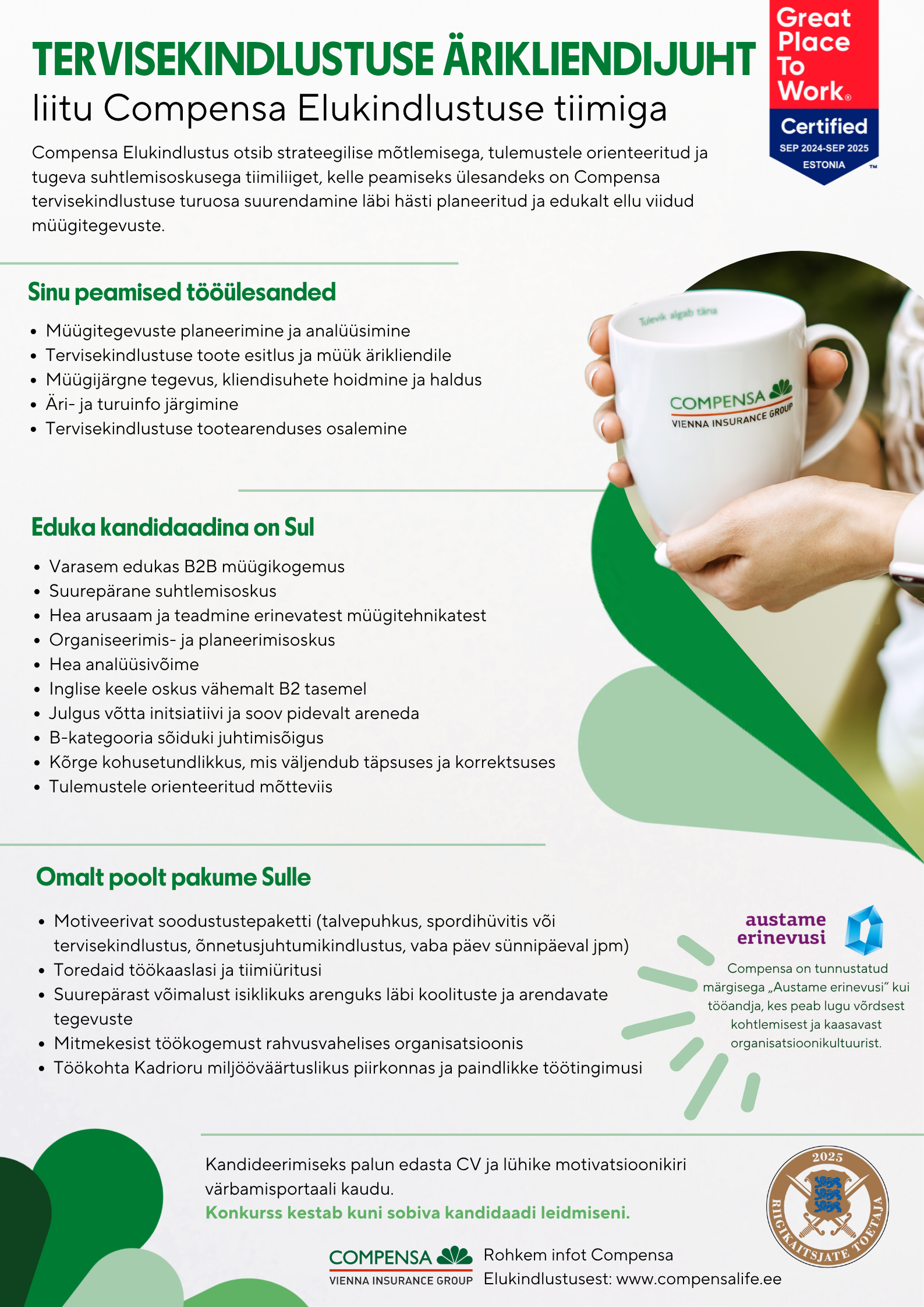 Compensa Life Vienna Insurance Group SE (1993) on üks vanimaid elukindlustusseltse Baltikumis ja kuulub täielikult Austria juhtivasse kindlustusgruppi Vienna Insurance Group. Meie eesmärk on aidata oma klientidel finantsriskidega toime tulla, pakkudes paindlikke ja ajakohaseid elukindlustuslahendusi. Compensa Elukindlustuse peakontor asub Eestis ning filiaalid Lätis ja Leedus. www.compensalife.eu