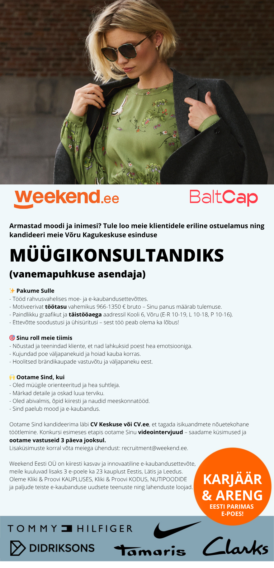 Weekend on kiiresti kasvav moe- ja jalatsikaubanduse ettevõte Baltikumis. Ühendame tavakaupluste keti ning e-kaubanduse tänu meie Kliki ja Proovi teenusele ning teeme ostlemise kiireks, mugavaks ja nauditavaks. Kui sind innustavad kaasaegsed tehnoloogiad ja soovid töötada dünaamilises keskkonnas koos professionaalse meeskonnaga, siis Weekend on õige koht, kus kasvada ja areneda.