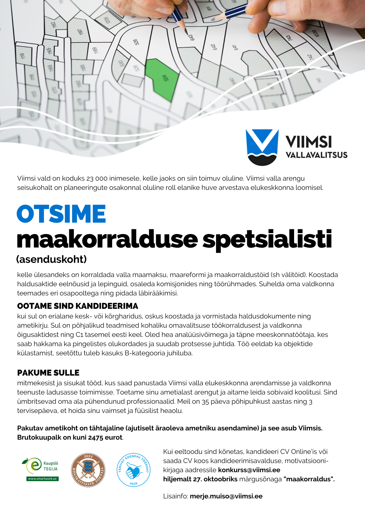 Viimsi vald on koduks üle 23 000 inimesele. Siinne kogukond väga hoolib oma mereäärsest elukeskkonnast ja elab kaasa Viimsis toimuvale. Vallavalitsuse töötajad pingutavad iga päev selle nimel, et piirkonna ja meie väikesaarte areng oleks tagatud moel, mis vastaks viimsilaste ja külaliste ootustele ja vajadustele. Teeme julgeid ja suuri asju eesmärgiga, et Viimsis oleks hea kasvada, elada, liikuda, nautida kultuuri ja loodust. Vallavalitsus koos allasutustega on tööandjaks ligikaudu 700 töötajale, kes annavad endast parima, et vajalikud teenused oleks tagatud ja inimesed tunneksid end Viimsis hoituna. Viimsilaste nimel tegutsedes ei unusta me ka enda töörõõmu - oleme tunnustatud tervisliku töökohana ja meile on omistatud tervist edendava töökoha märgis, oleme liitunud mitmekesisuse kokkuleppega. Väärtustame paindlikku töökorraldust ja omame kaugtöö tegija märgist.