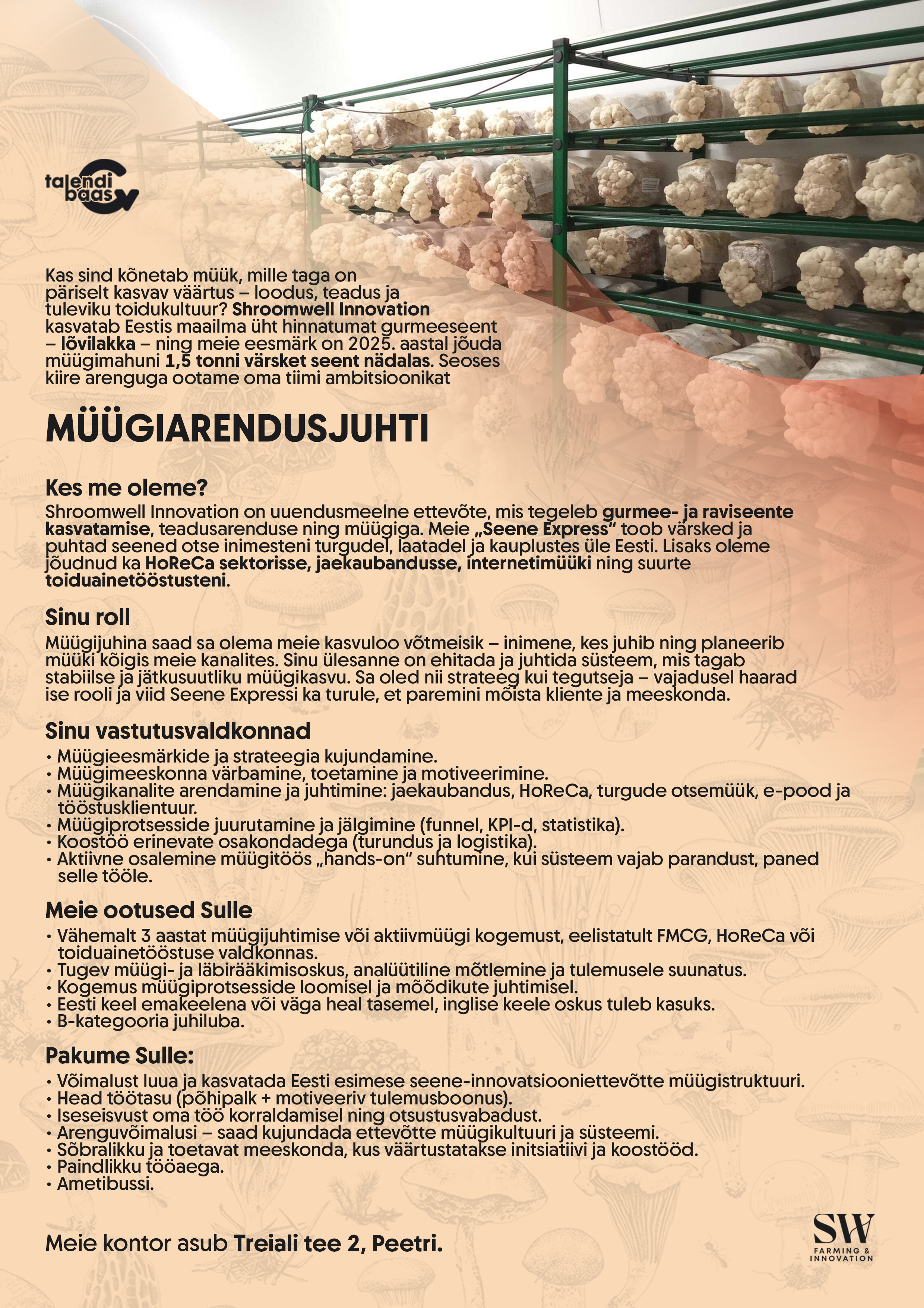 Oleme värbamisagentuur Talendibaas. Aitame leida oma kliendile Shroomwell Innovation MÜÜGIARENDUSJUHTI.