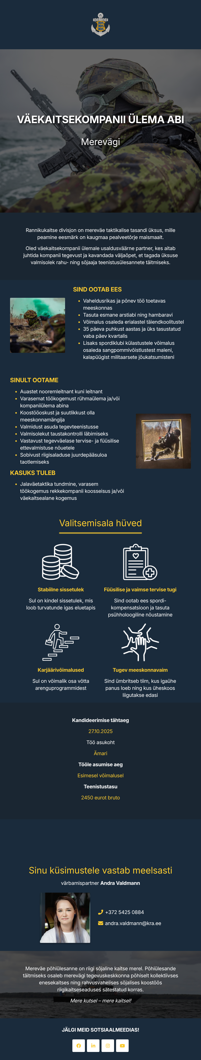 Mereväe põhiülesanne on riigi sõjaline kaitse merel. Põhiülesande täitmiseks osaleb merevägi tegevuskeskkonna põhiselt kollektiivses enesekaitses ning rahvusvahelises sõjalises koostöös riigikaitseseaduses sätestatud korras.