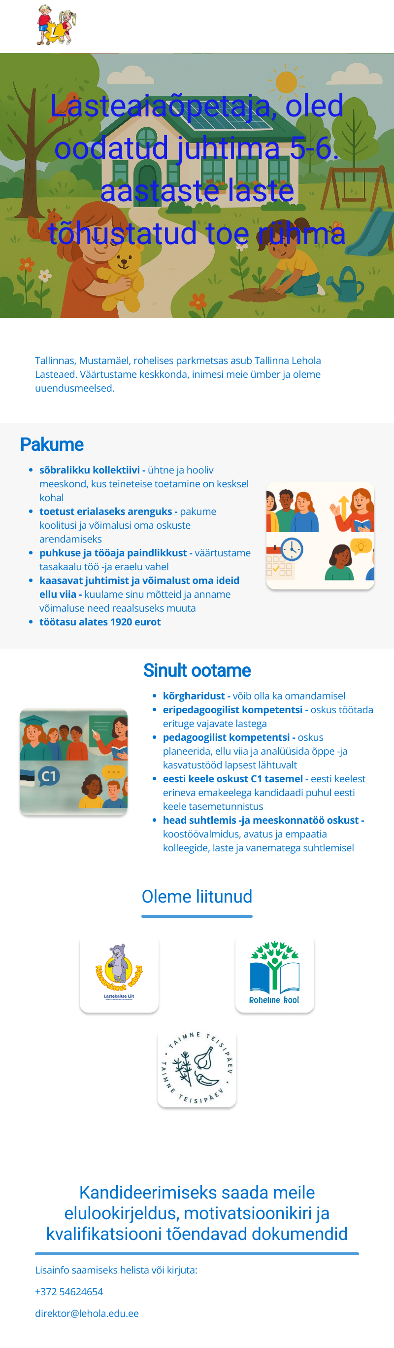 Tallinnas, Mustamäel, rohelises parkmetsas asub Tallinna Lehola Lasteaed. Väärtustame keskkonda, inimesi meie ümber ja oleme uuendusmeelsed.