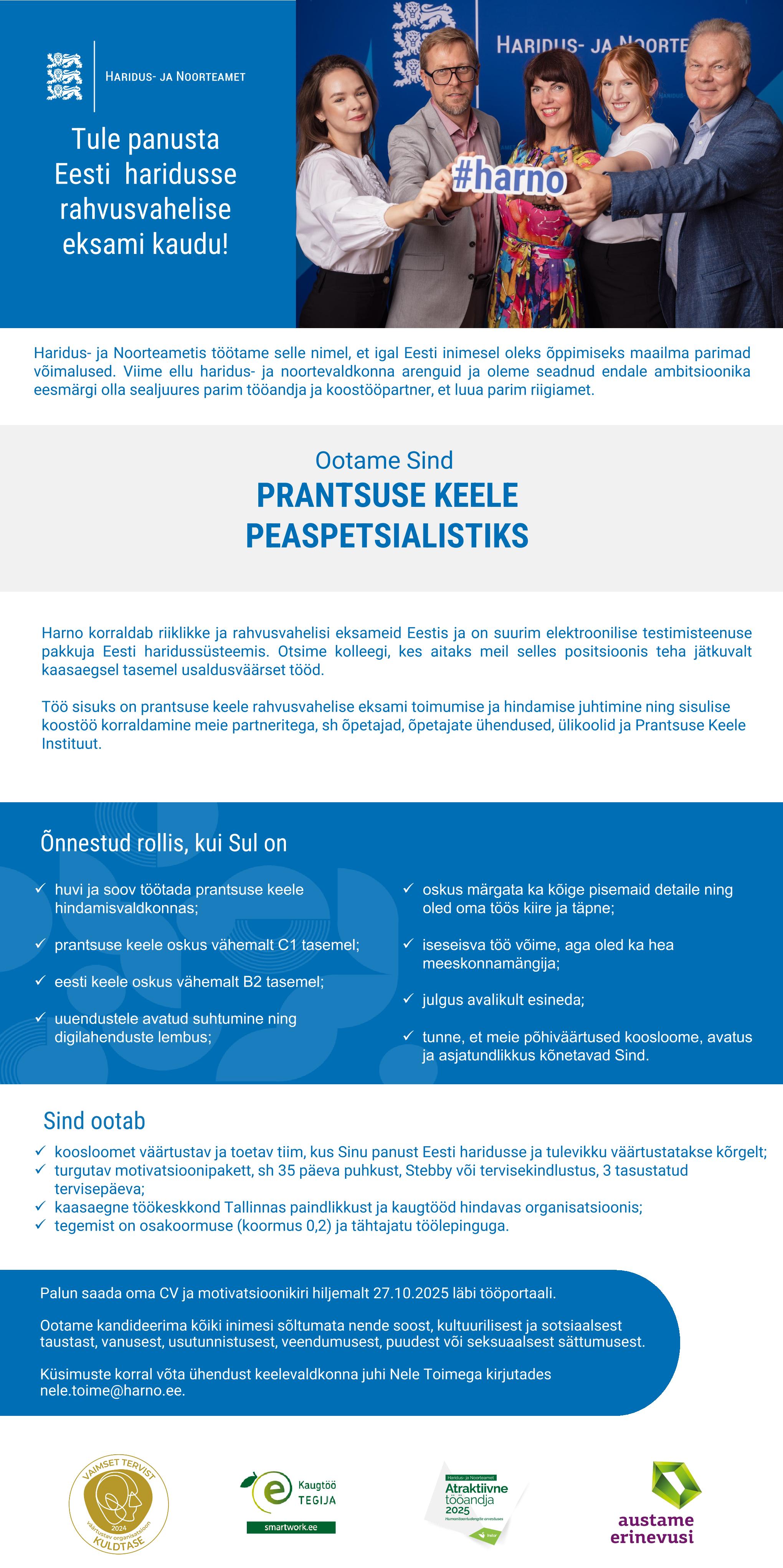 Haridus- ja Noorteametis töötame selle nimel, et igal Eesti inimesel oleks õppimiseks maailma parimad võimalused. Viime ellu haridus- ja noortevaldkonna arenguid ja oleme seadnud endale ambitsioonika eesmärgi olla parim tööandja, koostööpartner ja riigiamet.