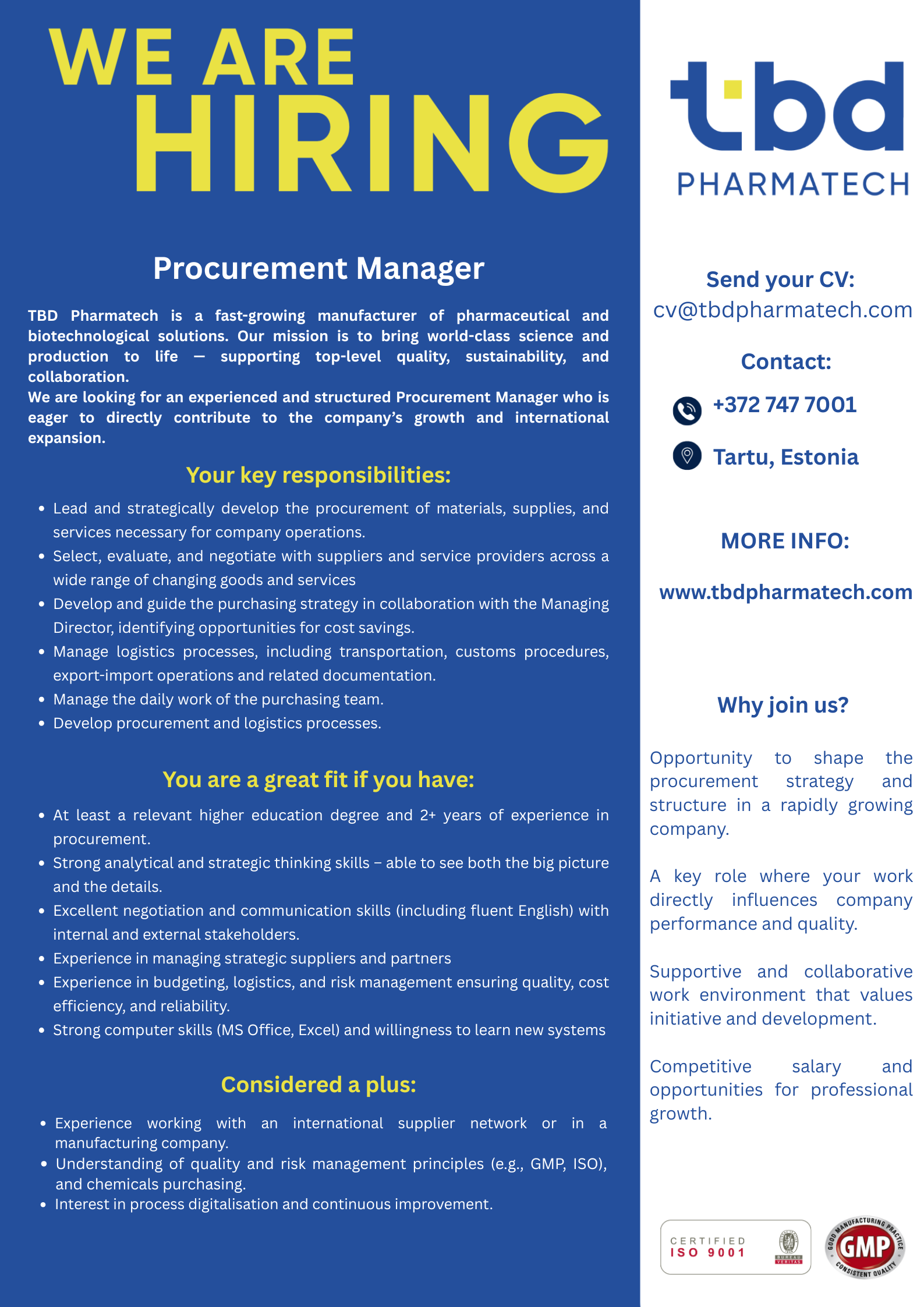 TBD Pharmatech on üks Eesti juhtivaid ja innovaatlisemaid biotehnoloogia firmasid. Oleme spetsialiseerunud ravimi toimeainete väiketootmisele ja arendustööle. Ettevõte on tunnustatud Eesti edukaimaks Keemia tööstuse ettevõtteks. TBD Pharmatech OÜ klientideks on biotehnoloogia, farmaatsia ja keemiaettevõtted nii Eestis kui ka välismaal. Ettevõttel on lai partnerite võrgustik kogu maailmas (EL, Šveits, Iisrael, USA, Venemaa, Lõuna-Korea ja Jaapan). Ettevõte kollektiiv on kasvav, sõbralik ning nooruslik. Hetkel töötab ettevõttes +70 inimest.