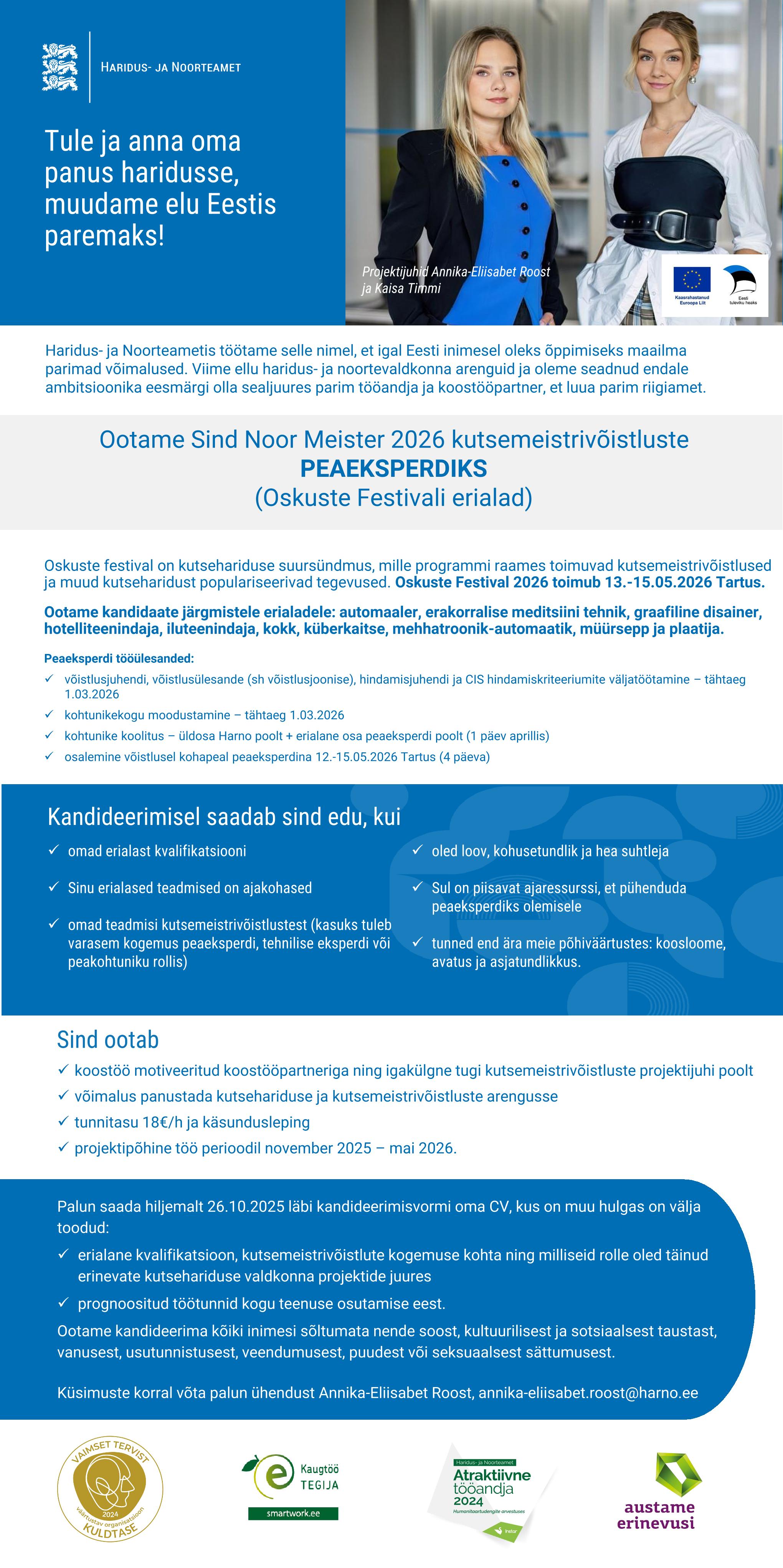 Haridus- ja Noorteametis töötame selle nimel, et igal Eesti inimesel oleks õppimiseks maailma parimad võimalused. Viime ellu haridus- ja noortevaldkonna arenguid ja oleme seadnud endale ambitsioonika eesmärgi olla parim tööandja, koostööpartner ja riigiamet.