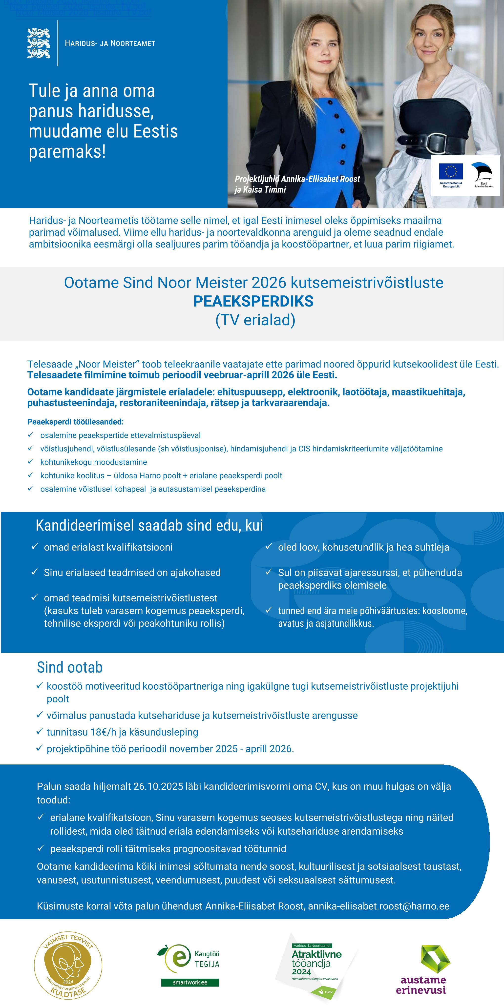 Haridus- ja Noorteametis töötame selle nimel, et igal Eesti inimesel oleks õppimiseks maailma parimad võimalused. Viime ellu haridus- ja noortevaldkonna arenguid ja oleme seadnud endale ambitsioonika eesmärgi olla parim tööandja, koostööpartner ja riigiamet.
