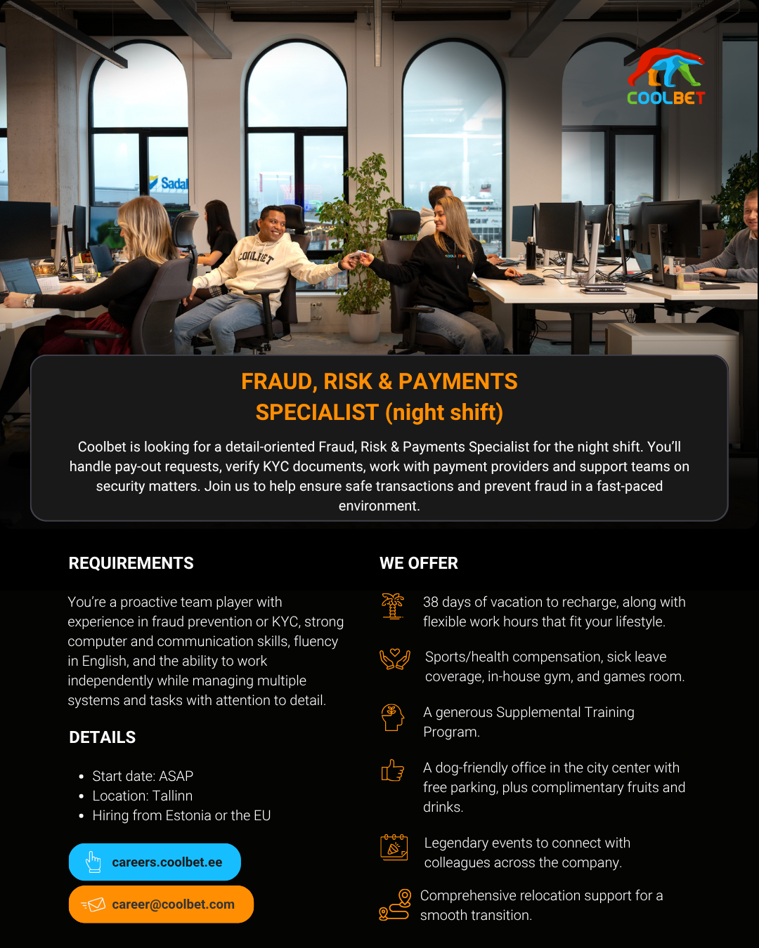 - Prefer English? Please find the ad in English here: https://careers.coolbet.ee/jobs/6542835-fraud-risk-payments-specialist-night-shift