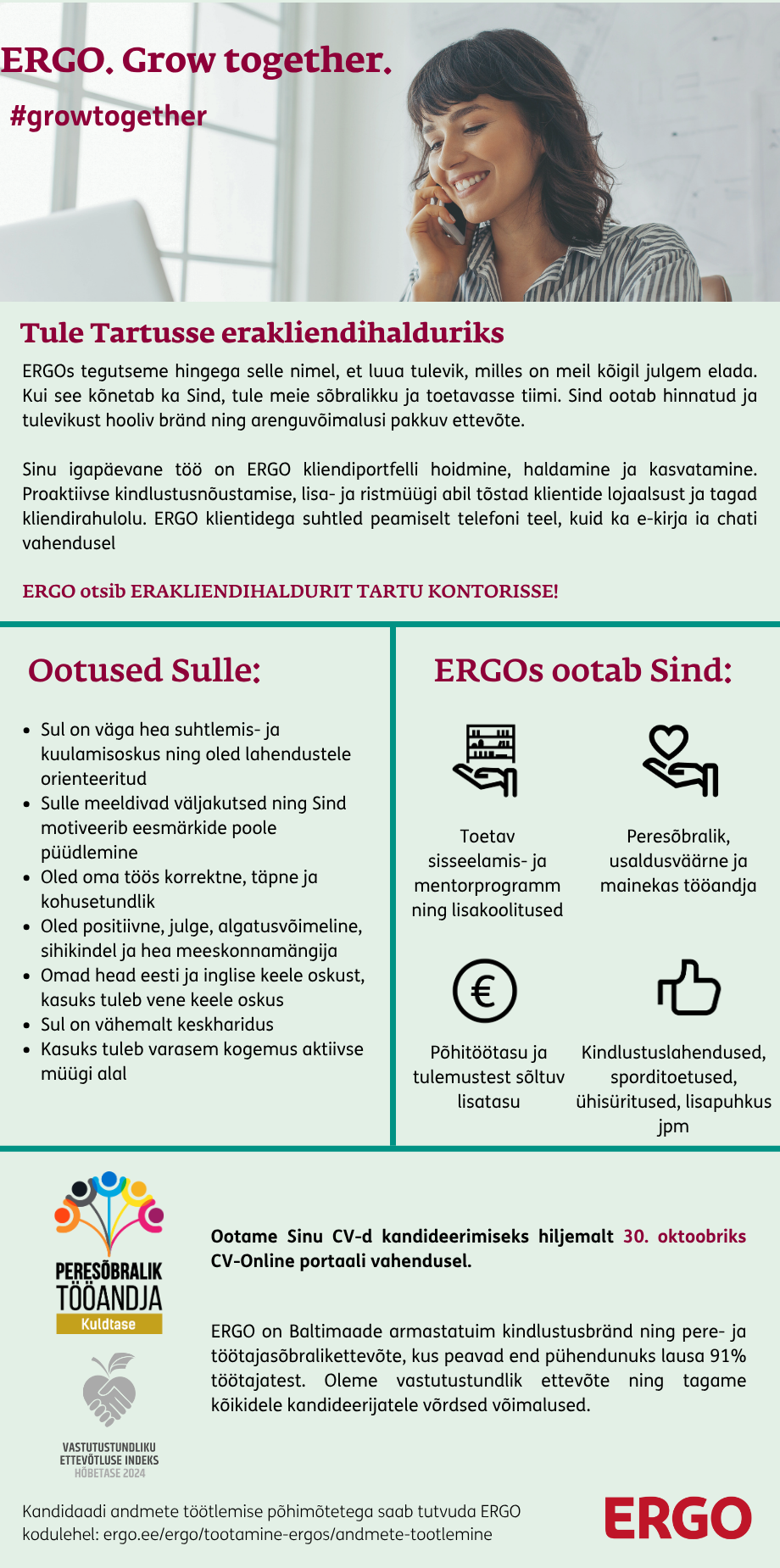 ERGO on kõige armastatum, inimlikum ja rohelisem kindlustusbränd Baltikumis, kus peavad end pühendunuks lausa 91% töötajatest. Meie kindlustusseltsi kogemusi ning pakutavaid vara-, elu ja ravikindlustusteenuseid usaldab Eestis üle 120 000 kliendi. Eesti ERGOkate toetavas meeskonnas annab selleks igapäevaselt oma panuse ligi 270 inimest. Meie töötajate sõnul on nad ERGO tööandjaks valinud just seetõttu, et meie tööl on suurem eesmärk luua julgem tulevik maandatud riskidega. Ning seda saab teha stabiilses ja arenguvõimalusi pakkuvas ettevõttes koos toetavate kolleegidega.