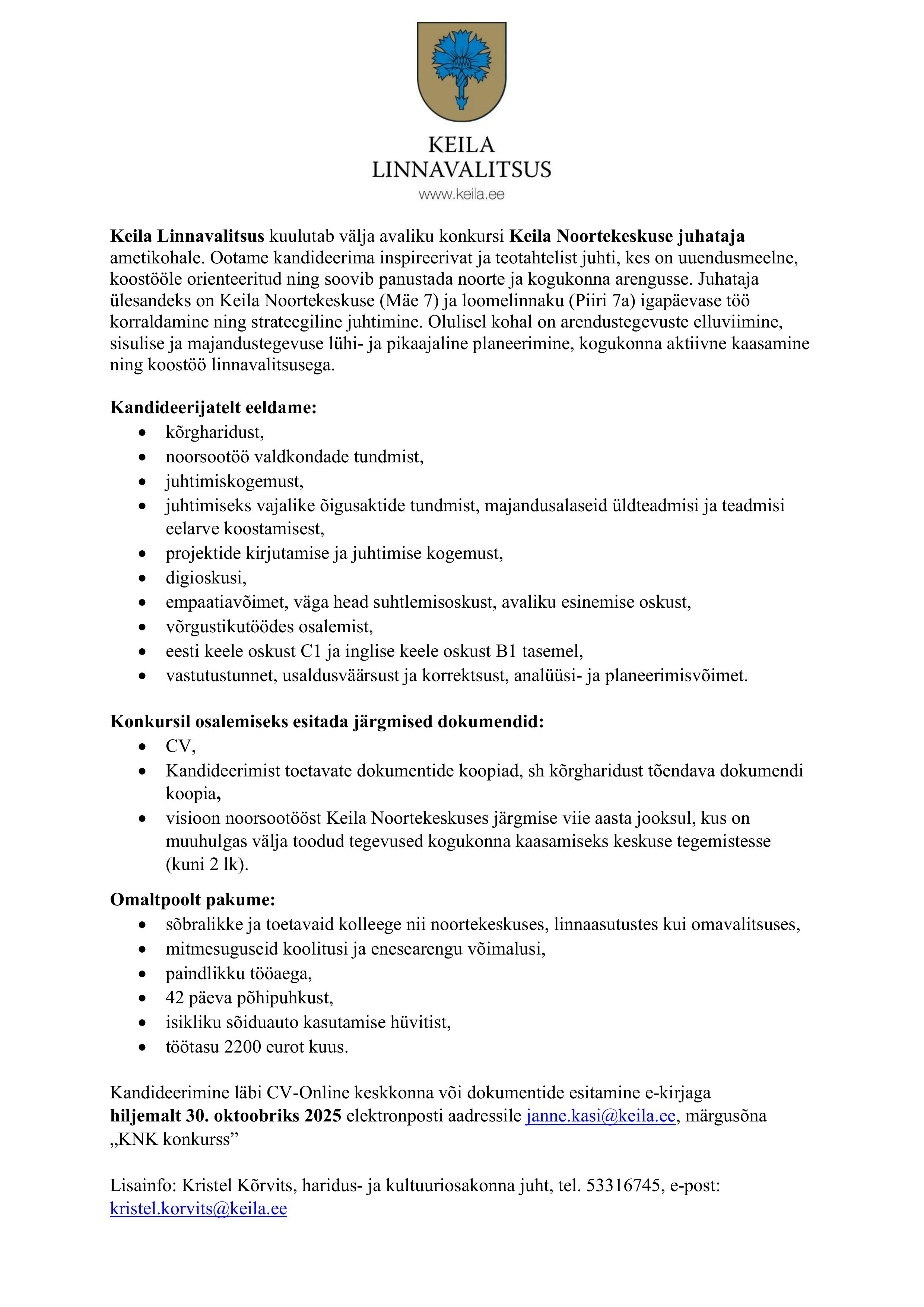 hiljemalt 30.oktoobriks 2025 elektronposti aadressile janne.kasi@keila.ee, märgusõna KNK konkurss