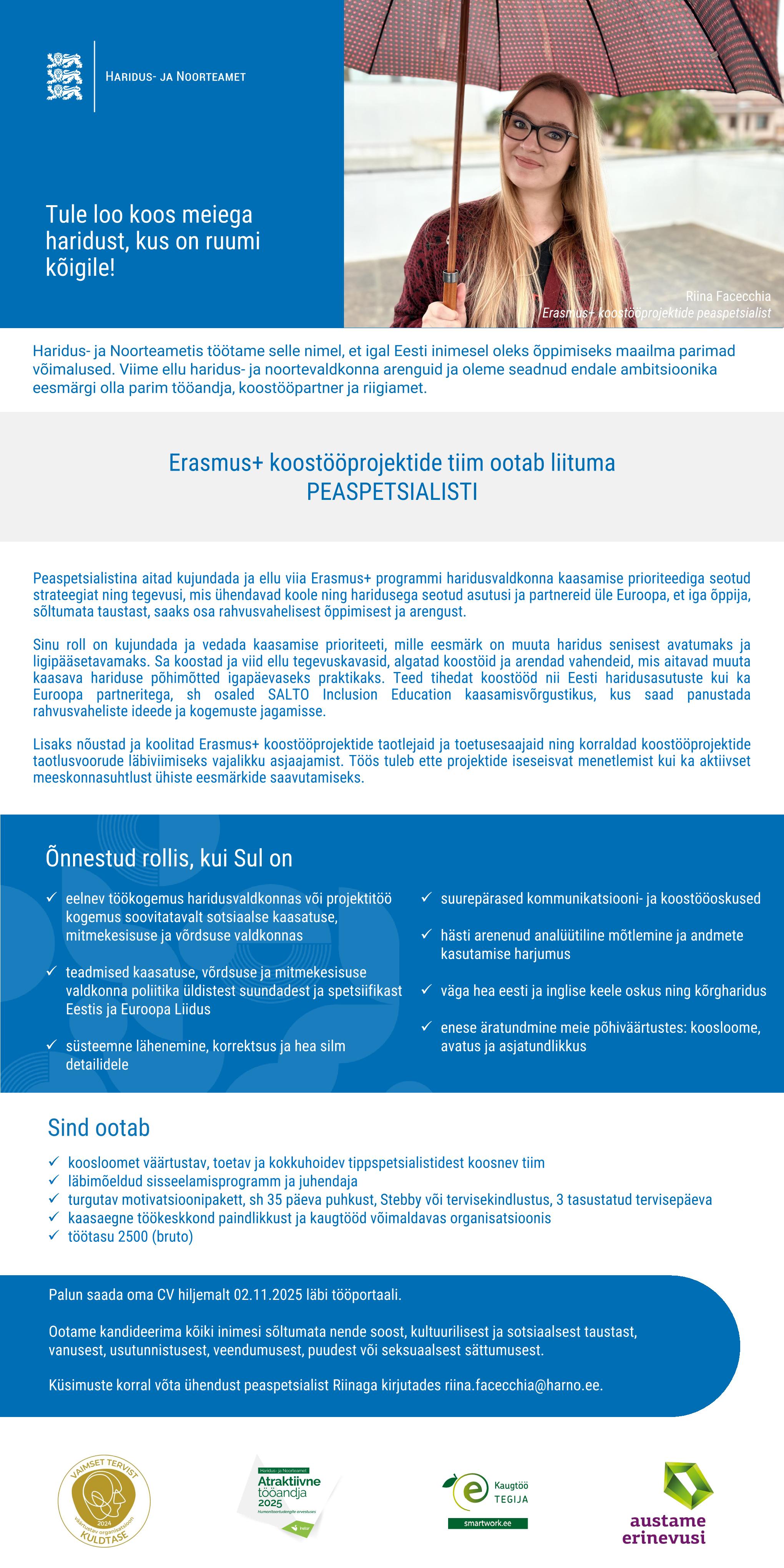 Haridus- ja Noorteametis töötame selle nimel, et igal Eesti inimesel oleks õppimiseks maailma parimad võimalused. Viime ellu haridus- ja noortevaldkonna arenguid ja oleme seadnud endale ambitsioonika eesmärgi olla parim tööandja, koostööpartner ja riigiamet.