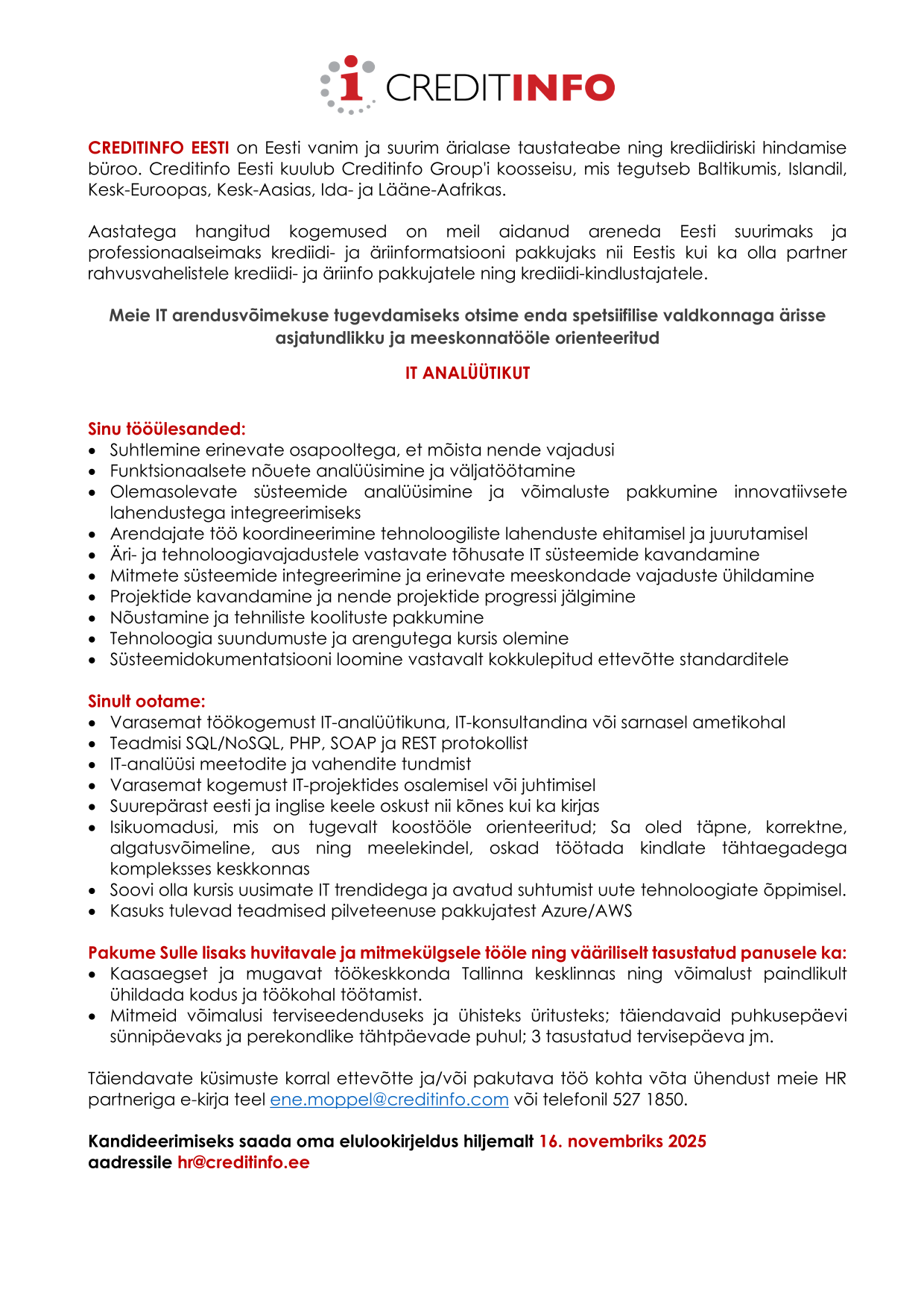 AS CREDITINFO EESTI on juhtiva rahvusvahelise krediidiinformatsiooni, riskide halduse teenuseid ja turuinfo lahendusi pakkuva Creditinfo Group tütarettevõte. Meie põhiülesandeks on aidata ettevõtjatel teha kiiresti õigeid krediidiotsuseid, hoida võlgnevused kontrolli all ja kasvatada äri käivet. Oleme Eesti suurim ja kogenuim krediidi- ja äriinformatsiooni pakkuja omades kõige põhjalikumat andmekogu.