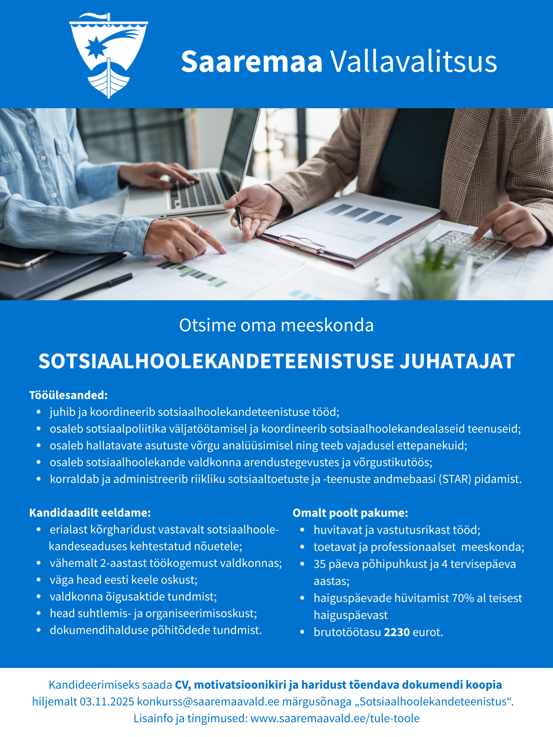 Saaremaa vald on Eesti suurim kohalik omavalitsus. Meiega liitudes annad panuse edendamaks elu Saaremaal. Tule, tee ja saa osa oma tööviljadest, sest iga töölõik on valla kui ka maakonna elu hüvanguks oluline ning tulemus kohe märgata. Anna panus nii Saaremaa Vallavalitsuse kui ka Saaremaa elanike heaks!