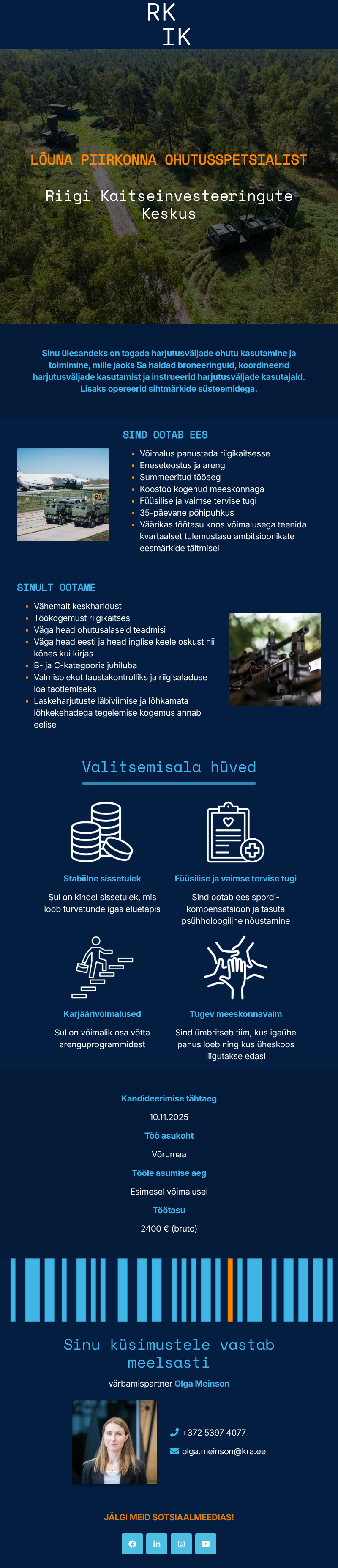 RKIK – Riigi Kaitseinvesteeringute Keskus – on kaitseministeeriumi valitsemisala keskne hankija, kes vastutab materjalide ja teenuste kättesaadavuse eest ning tagab riigikaitseks vajaliku toimiva ja ohutu taristu. Meie eesmärk on võimaldada riigikaitsetega tegelevatel organisatsioonidel keskenduda oma põhitegevustele, vähendades nende halduskoormust ja tagades Eesti kaitsevõime maksimaalselt efektiivse arengu. Meie kollektiivi kuuluvad oma valdkondade tipptasemel insenerid, spetsialistid ja juhid, kokad ja abikokad, kes tagavad enda oskuste ja teadmistega kaitsevaldkonna kiire ning efektiivse varustatuse ja arengu.