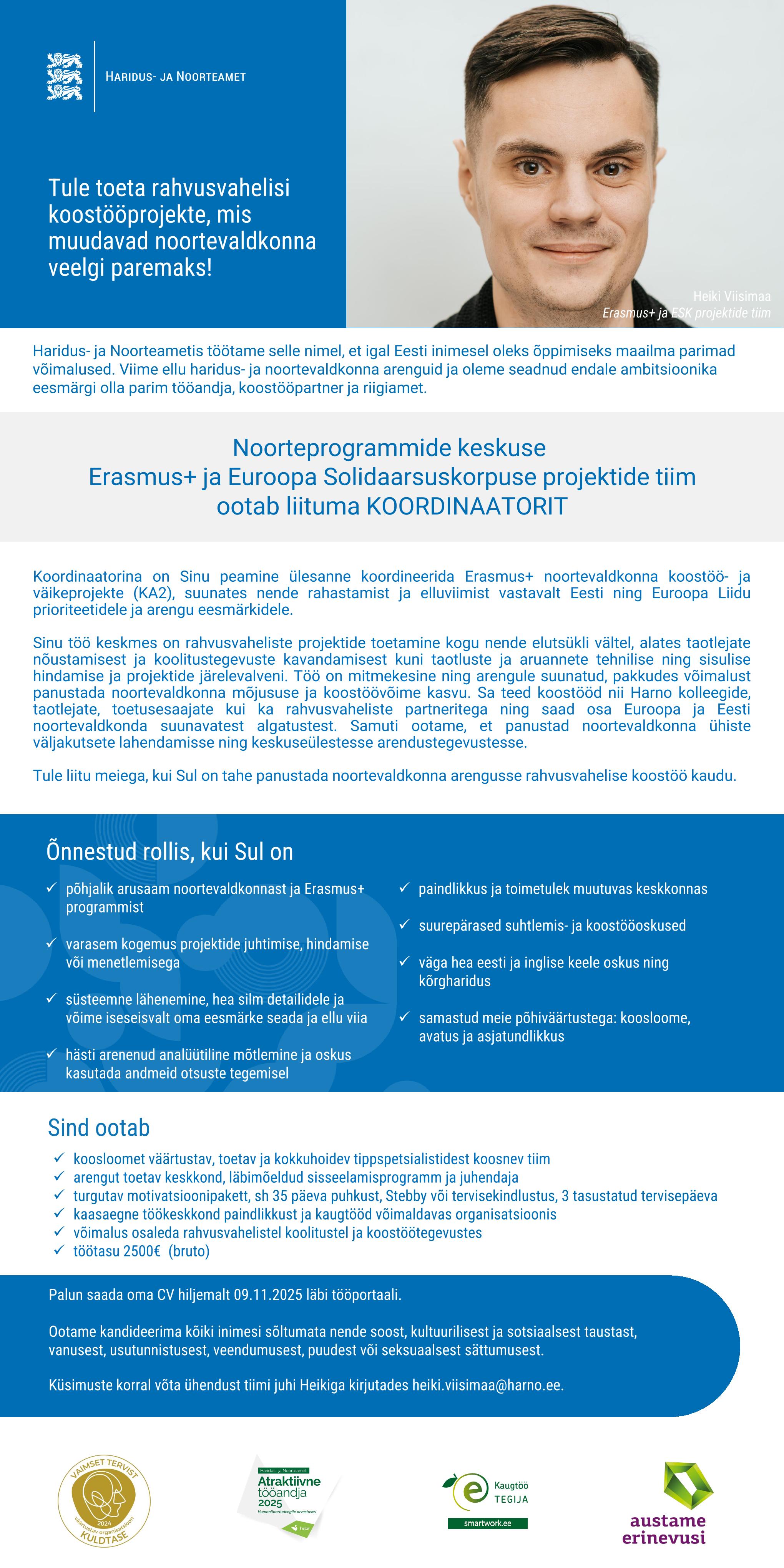 Haridus- ja Noorteametis töötame selle nimel, et igal Eesti inimesel oleks õppimiseks maailma parimad võimalused. Viime ellu haridus- ja noortevaldkonna arenguid ja oleme seadnud endale ambitsioonika eesmärgi olla parim tööandja, koostööpartner ja riigiamet.