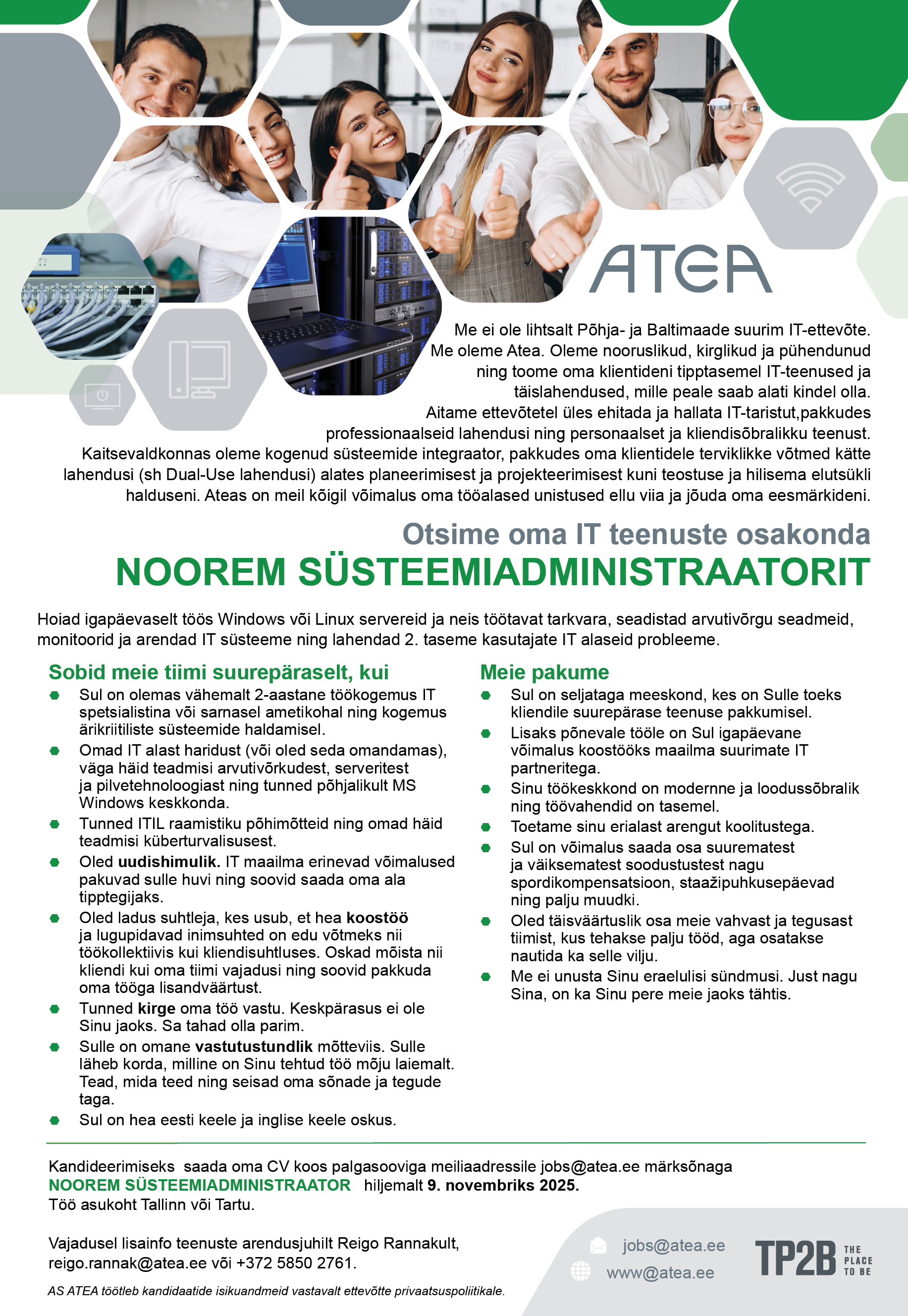 Me ei ole lihtsalt Põhja- ja Baltimaade suurim IT-ettevõte. Me oleme Atea. Oleme nooruslikud, kirglikud ja pühendunud ning toome oma klientideni tipptasemel IT-teenused ja täislahendused, mille peale saab alati kindel olla. Aitame ettevõtetel üles ehitada ja hallata IT-taristut, pakkudes professionaalseid lahendusi ning personaalset ja kliendisõbralikku teenust. Kaitsevaldkonnas oleme kogenud süsteemide integraator, pakkudes oma klientidele terviklikke võtmed kätte lahendusi (sh Dual-Use lahendusi) alates planeerimisest ja projekteerimisest kuni teostuse ja hilisema elutsükli halduseni. Ateas on meil kõigil on võimalus oma tööalased unistused ellu viia ja jõuda oma eesmärkideni.