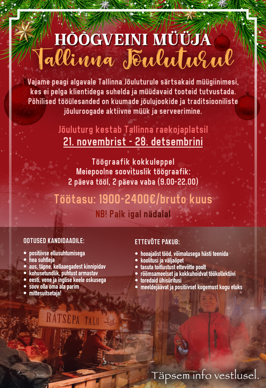 Vajame Tallinna Jõuluturule, särtsakaid müügitüdrukuid, kes ei pelga klientidega suhelda ja müüdavaid tooteid tutvustada. Põhilised tööülesanded on kuumade jõulujookide ja traditsiooniliste jõuluroogade aktiivne müük ja serveerimine. Jõuluturg kestab 21.11-28.12. Töögraafik kokkuleppel. Soovituslik töögraafik: 2 päeva tööl, 2 päeva vaba (9.00-22.00)Töötasu: 1900-2400€/ kuus bruto. Täpsem info vestlusel.