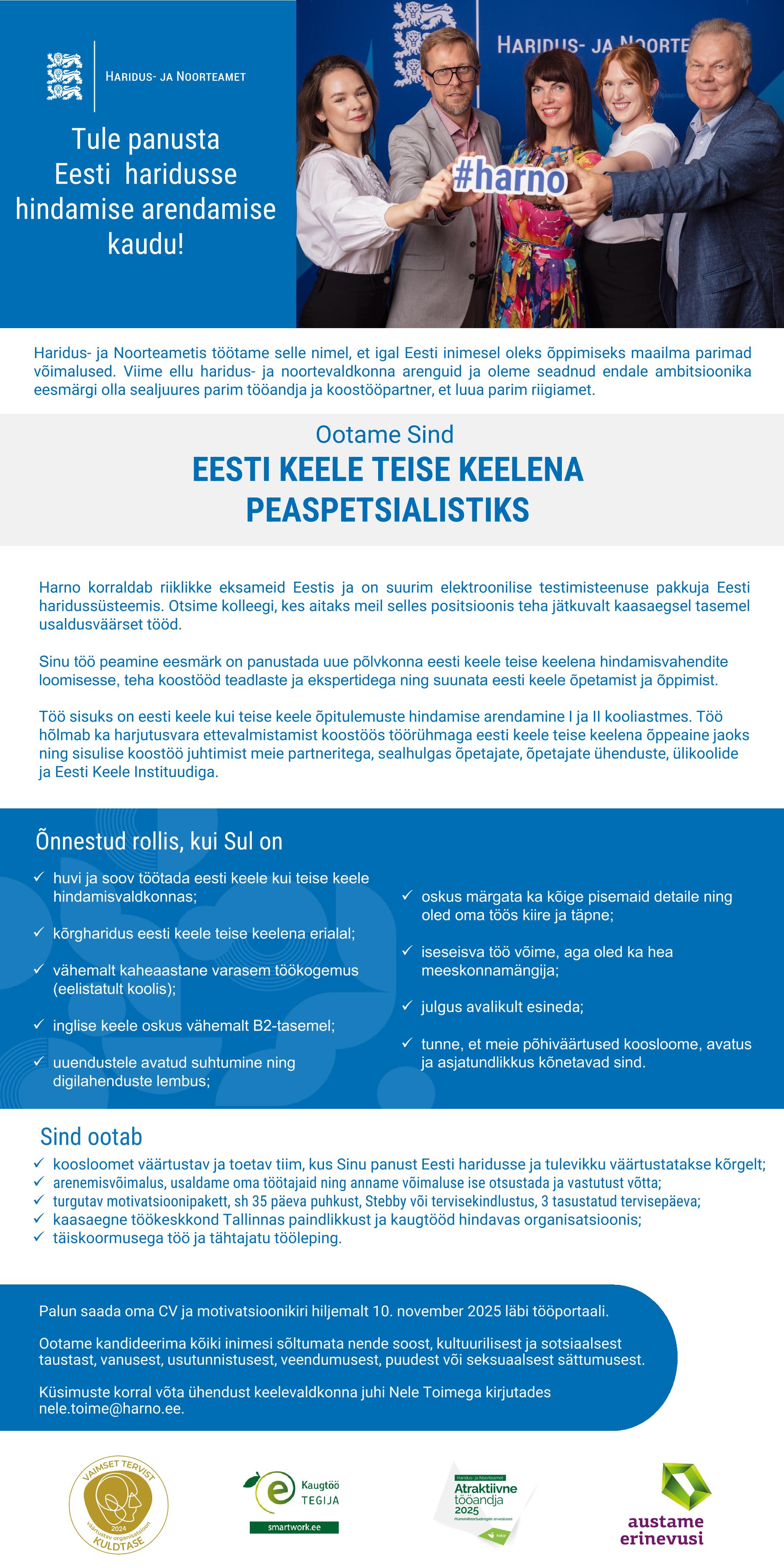 Haridus- ja Noorteametis töötame selle nimel, et igal Eesti inimesel oleks õppimiseks maailma parimad võimalused. Viime ellu haridus- ja noortevaldkonna arenguid ja oleme seadnud endale ambitsioonika eesmärgi olla parim tööandja, koostööpartner ja riigiamet.