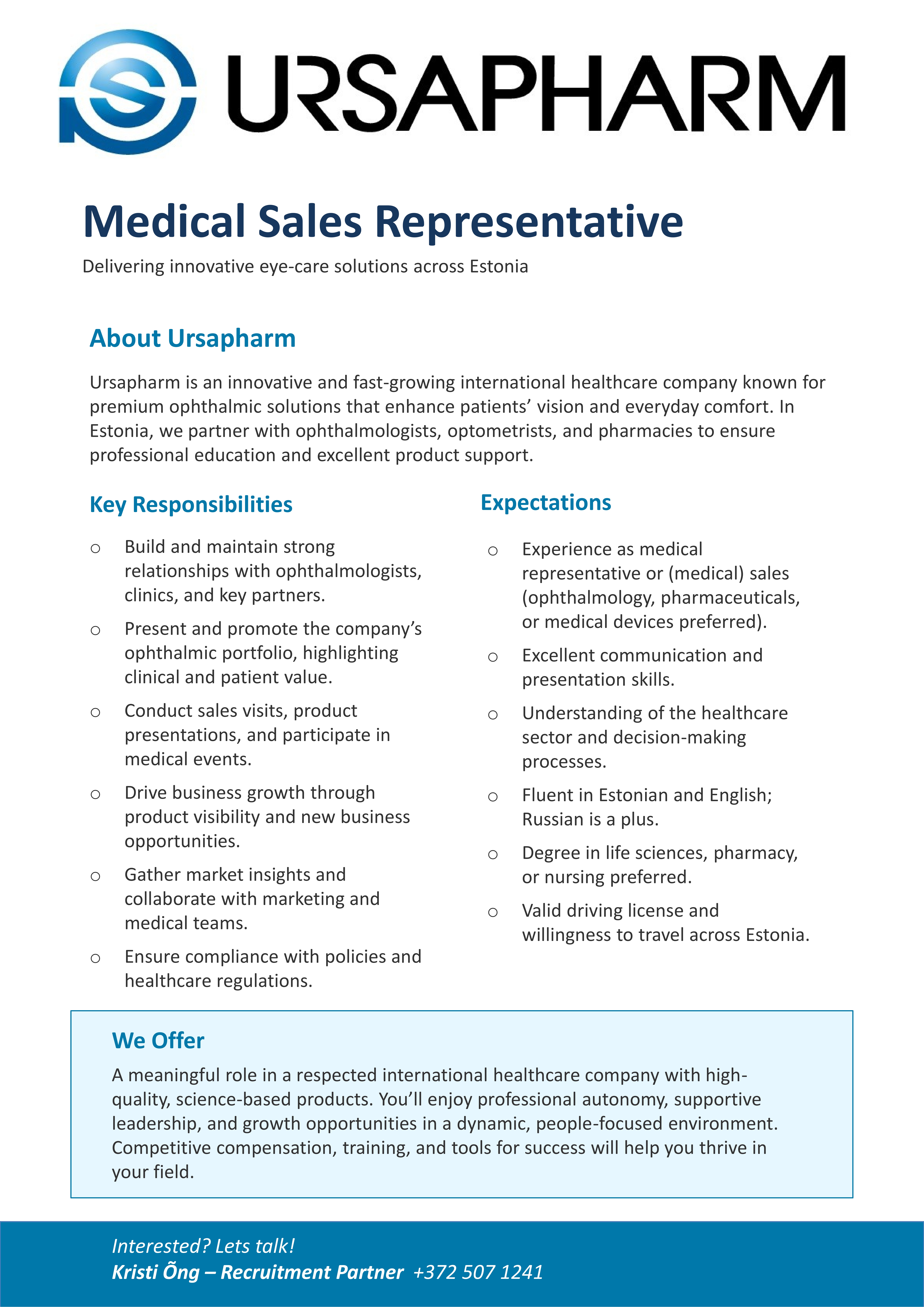 Ursapharm is seeking a dynamic and self-driven Medical Sales Representative to strengthen its presence in the Estonian market. The main focus is on promoting and selling premium eye drops and related ophthalmic products to ophthalmologists and key medical professionals across Estonia. The right candidate is an active communicator, bold and confident in customer interactions, and thrives on achieving visible results. You will have the opportunity to work with one of the best-known products in the field, supported by a strong international brand and high customer trust.