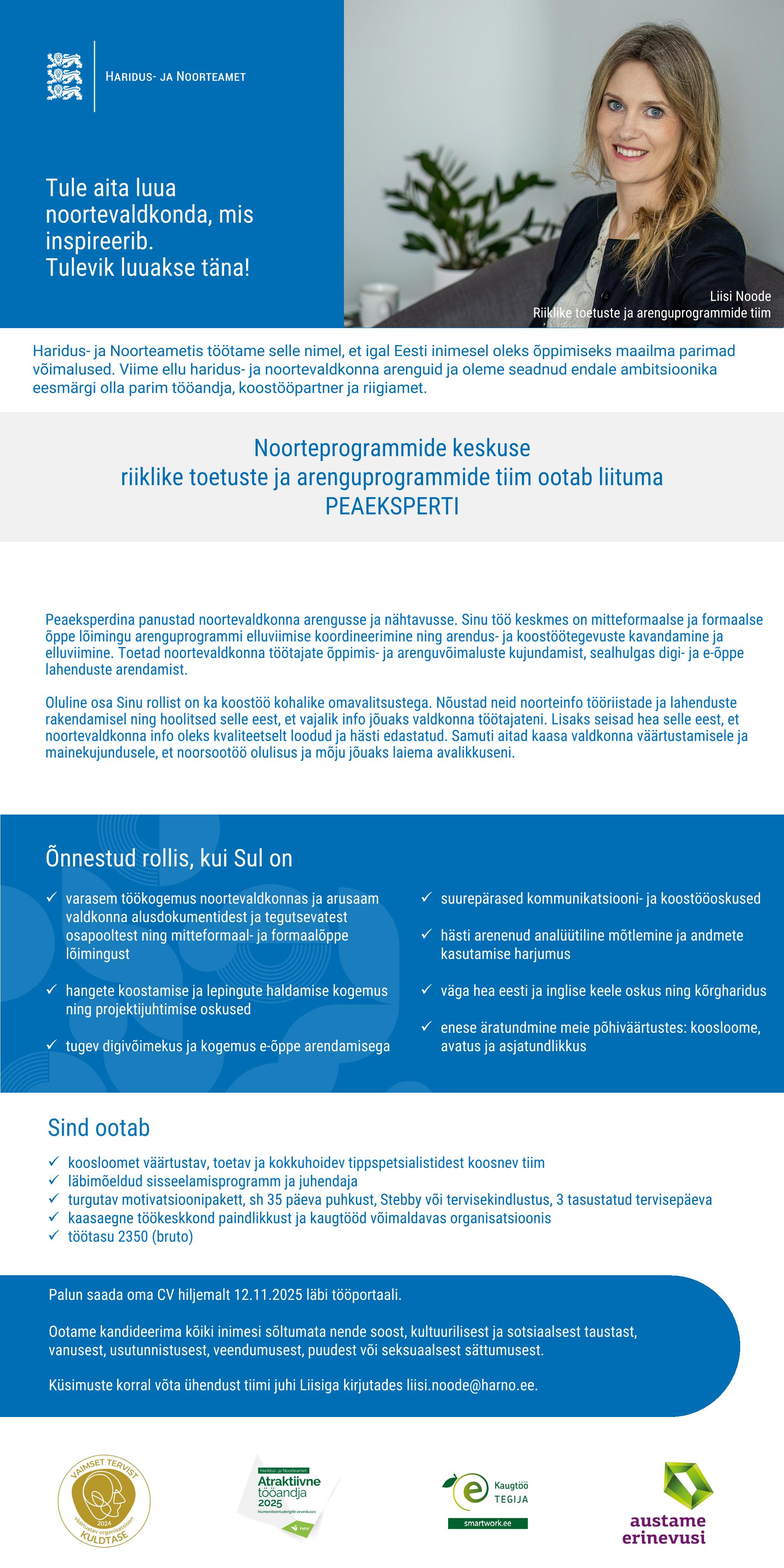 Haridus- ja Noorteametis töötame selle nimel, et igal Eesti inimesel oleks õppimiseks maailma parimad võimalused. Viime ellu haridus- ja noortevaldkonna arenguid ja oleme seadnud endale ambitsioonika eesmärgi olla parim tööandja, koostööpartner ja riigiamet.