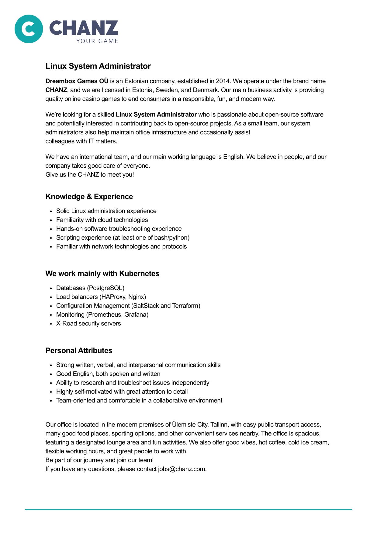 Dreambox Games OÜ is an Estonian company, established in 2014. We operate under the brand name CHANZ, and we are licensed in Estonia, Sweden, and Denmark. Our main business activity is providing quality online casino games to end consumers in a responsible, fun, and modern way.