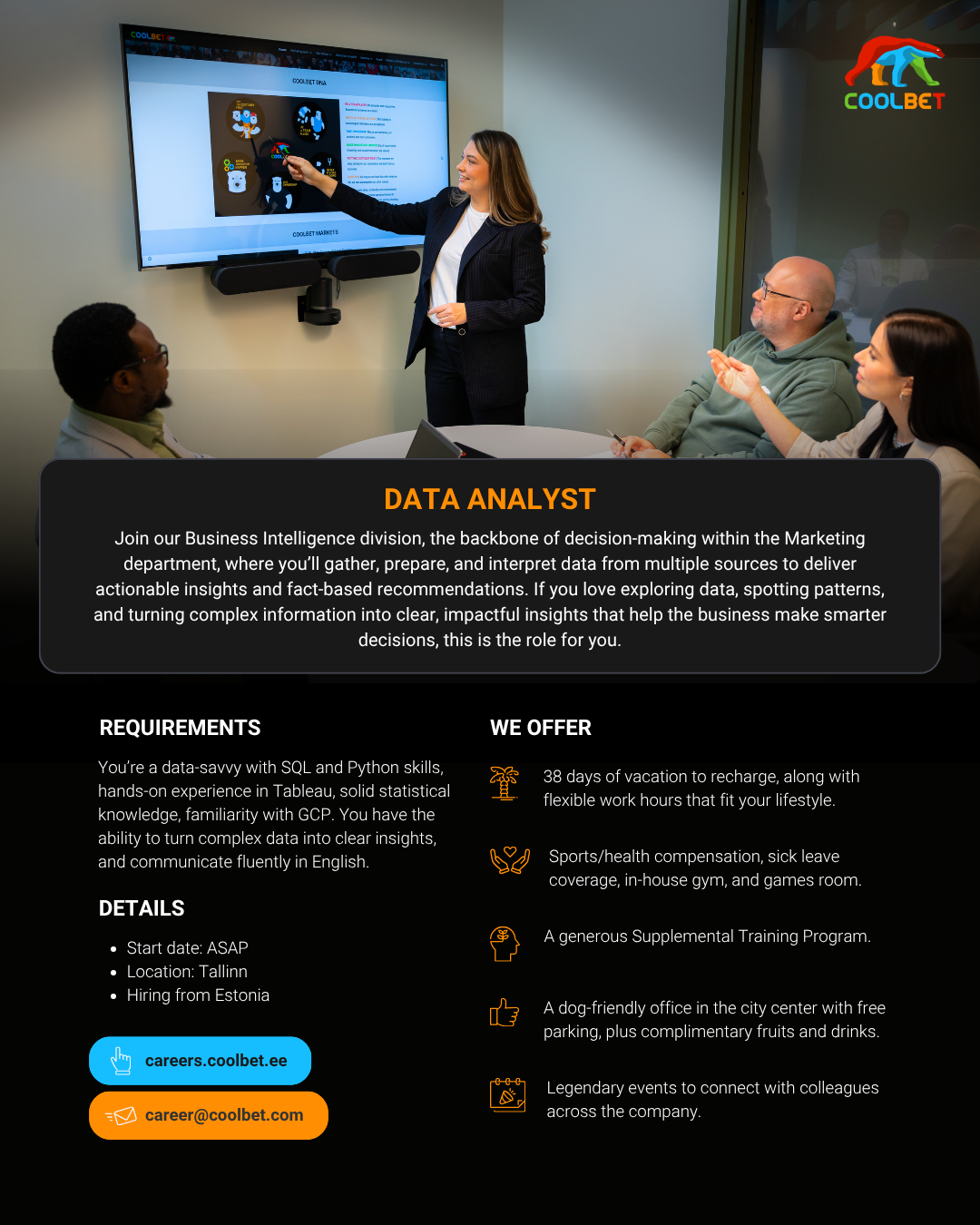 - Prefer English? Please find the ad in English here: https://careers.coolbet.ee/jobs/6674941-data-analyst