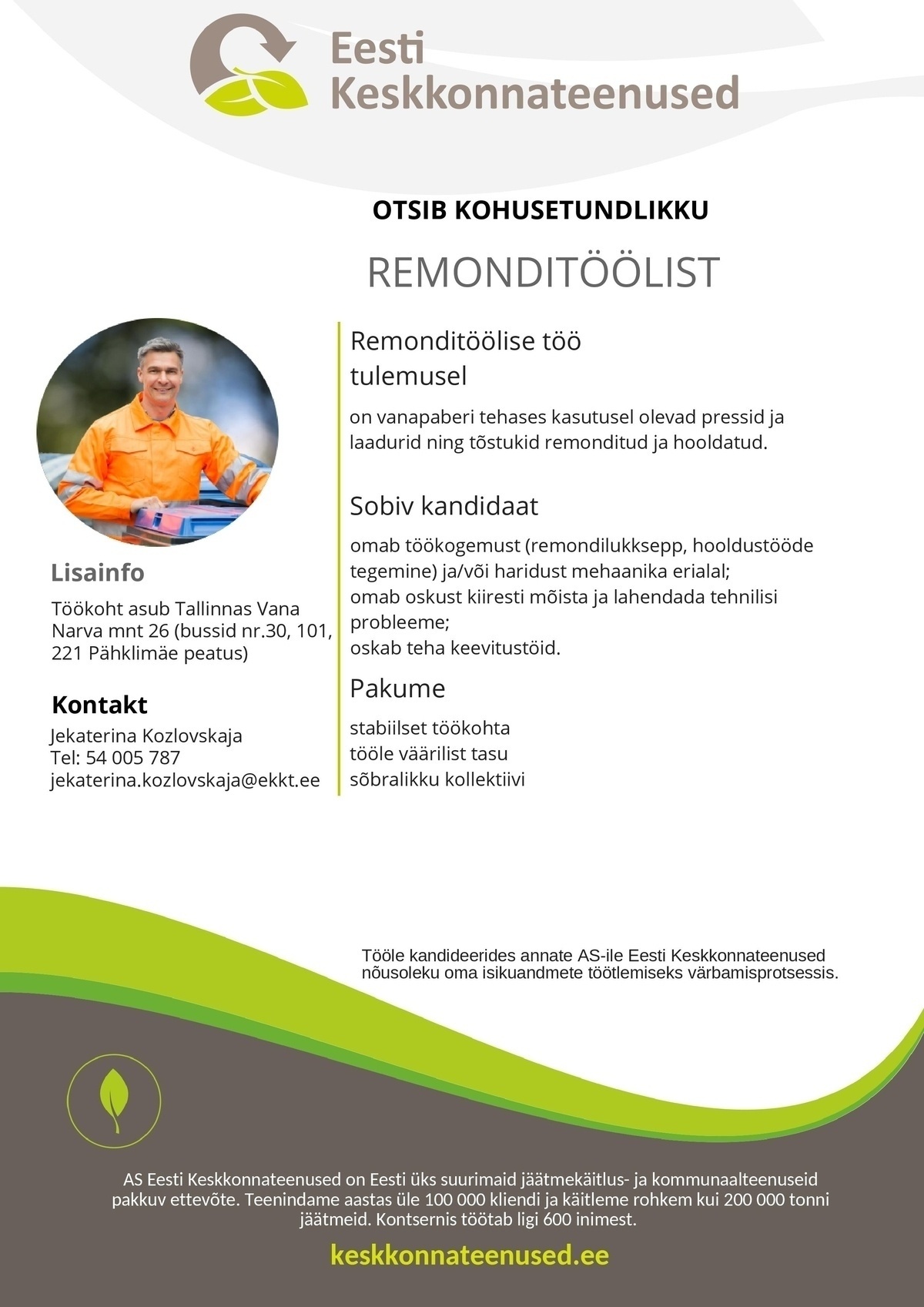 Sobiv kandidaat omab töökogemust (remondilukksepp, hooldustööde tegemine) ja/või haridust mehaanika erialal;