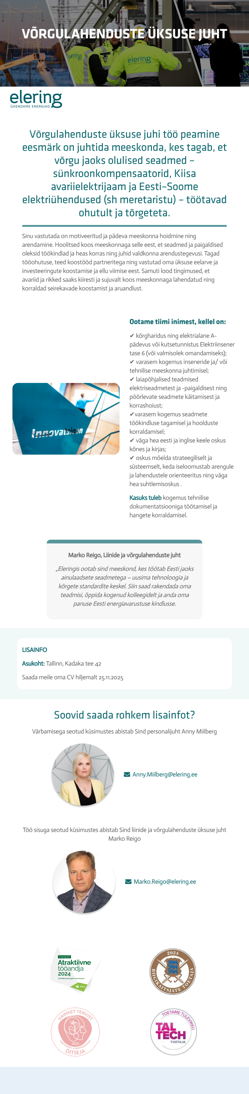 Eleringi suurimaks varaks on üle 300 kõrge kvalifikatsiooniga tippspetsialisti. Töösuhte hoidmine pühendunud töötajatega ning atraktiivse tööandja maine kujundamine noorte talentide silmis võimaldavad edukalt toime tulla Eleringi vastutusrikka rolliga.