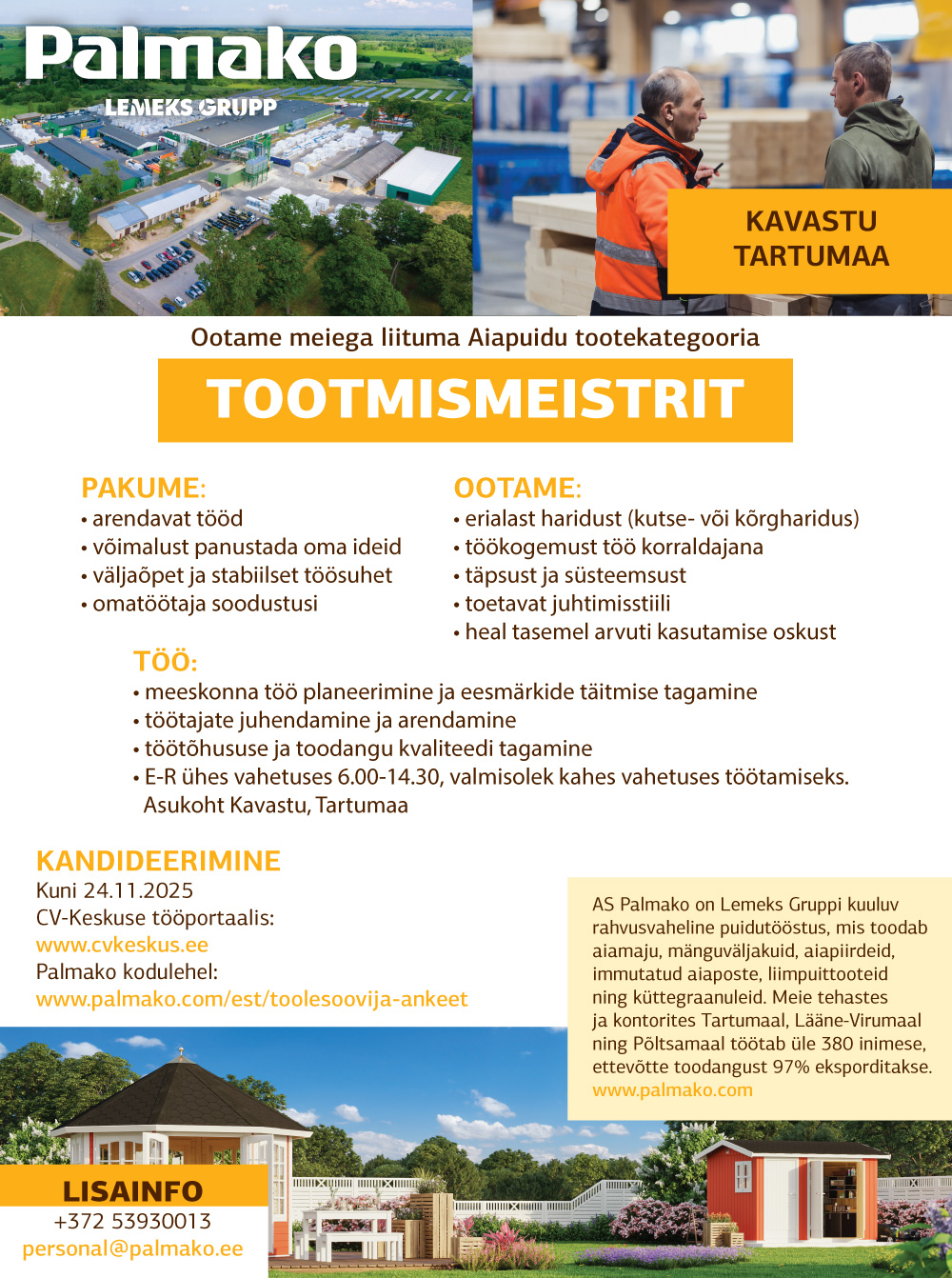 AS Palmako on Lemeks Gruppi kuuluv rahvusvaheline puidutööstus, mis toodab aiamaju, mänguväljakuid, aiapiirdeid, immutatud aiaposte, liimpuittooteid ning küttegraanuleid. Meie tehastes ja kontorites Tartumaal, Lääne-Virumaal ning Põltsamaal töötab üle 380 inimese, ettevõtte toodangust 97% eksporditakse.www.palmako.com