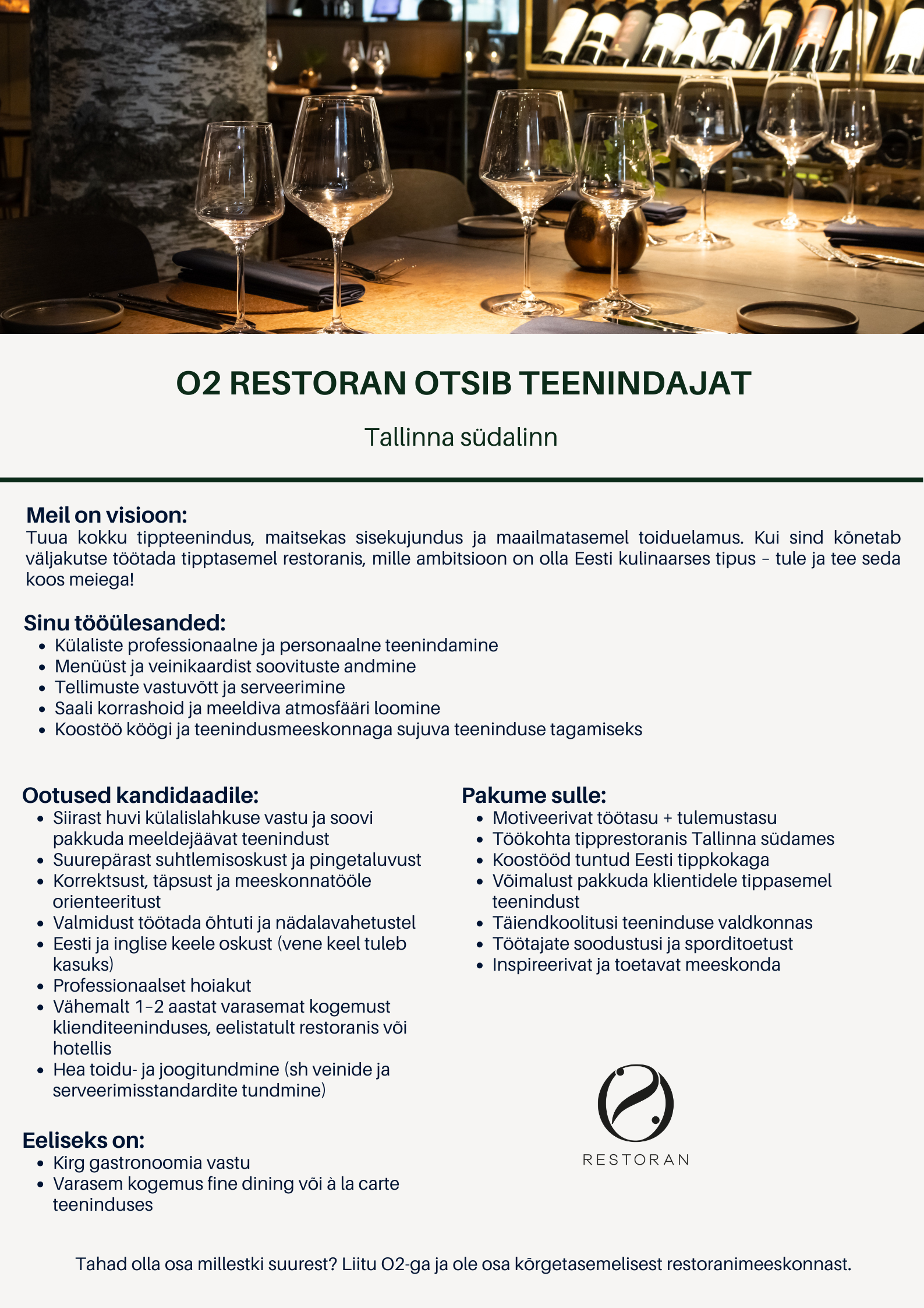 Restoran O2 on paik, kus Skandinaavia puhtus ja Aasia maitsete põnevus kohtuvad, mida meie ise nimetame Skandinaasiaks. Peakokk Martin Meikas on loonud menüü, mis ühendab põhjamaiseid tehnikaid ja hooajalist toorainet koos Aasia nüanssidega. Ta juhib kööki filosoofiaga, mis harmooniliselt ühendab põhjamaise traditsiooni ja Aasia valmistusvõtete rafineerituse. Restoran pakub hooajalist toorainet, säilitades selle naturaalset iseloomu ning lisades idamaise nüansi. Interjöör peegeldab põhjamaist minimalismi ja Aasia esteetikat, kasutades tagasihoidlikku dekoratsiooni ja peent valguslahendust.
