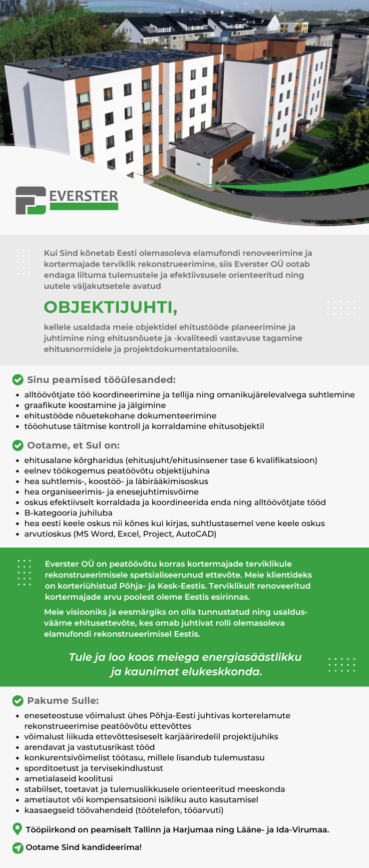 Oled oodatud kandideerima meie meeskonnaga liitumiseks, kui sind kõnetab Eesti olemasoleva elamufondi renoveerimine ja kortermajade terviklik rekonstrueerimine. Sind iseloomustab koostöövalmidus, kasvule ja õppimisele orienteeritus, positiivsus, autentsus, töökus, sihikindlus ning sulle meeldib inimestega suhelda.