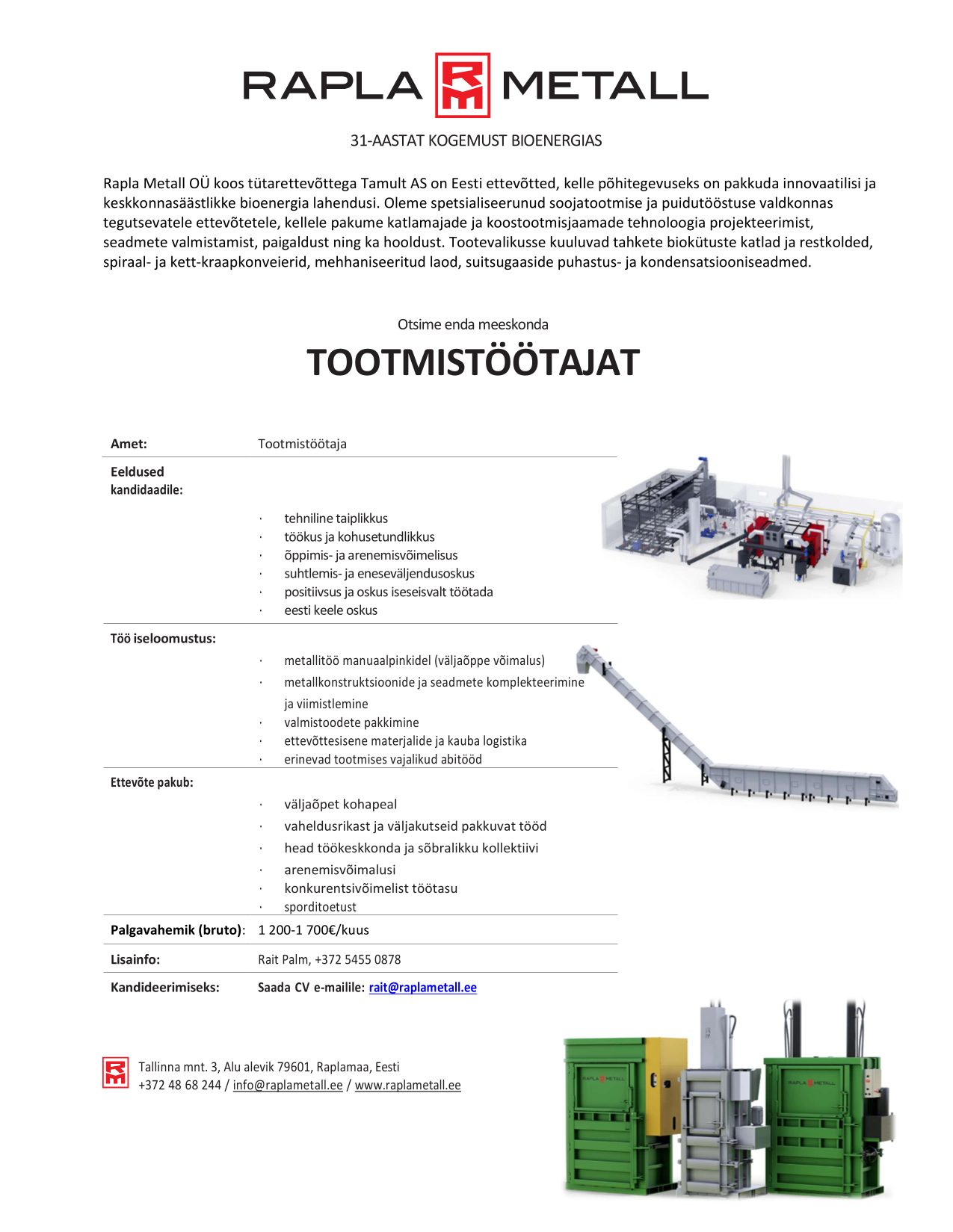 Rapla Metall OÜ koos tütarettevõttega Tamult AS on Eesti ettevõtted, kelle põhitegevuseks on pakkuda innovaatilisi ja keskkonnasäästlikke bioenergia lahendusi. Oleme spetsialiseerunud soojatootmise ja puidutööstuse valdkonnas tegutsevatele ettevõtetele, kellele pakume katlamajade ja koostootmisjaamade tehnoloogia projekteerimist, seadmete valmistamist, paigaldust ning ka hooldust.