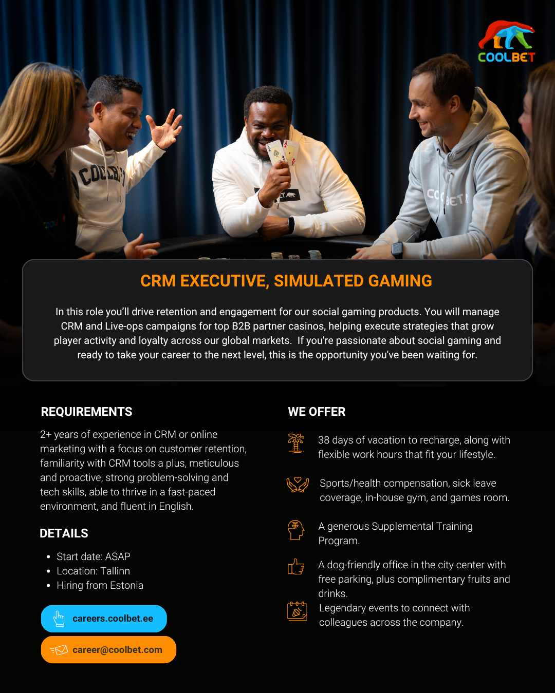 - Prefer English? Please find the ad in English here: https://careers.coolbet.ee/jobs/6732510-crm-executive-simulated-gaming