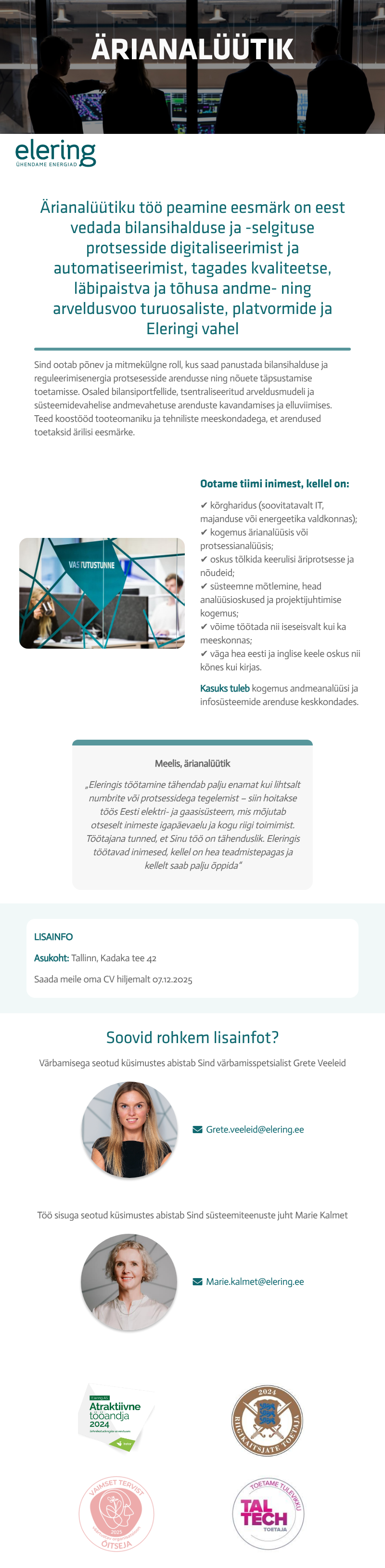 Eleringi suurimaks varaks on üle 300 kõrge kvalifikatsiooniga tippspetsialisti. Töösuhte hoidmine pühendunud töötajatega ning atraktiivse tööandja maine kujundamine noorte talentide silmis võimaldavad edukalt toime tulla Eleringi vastutusrikka rolliga.
