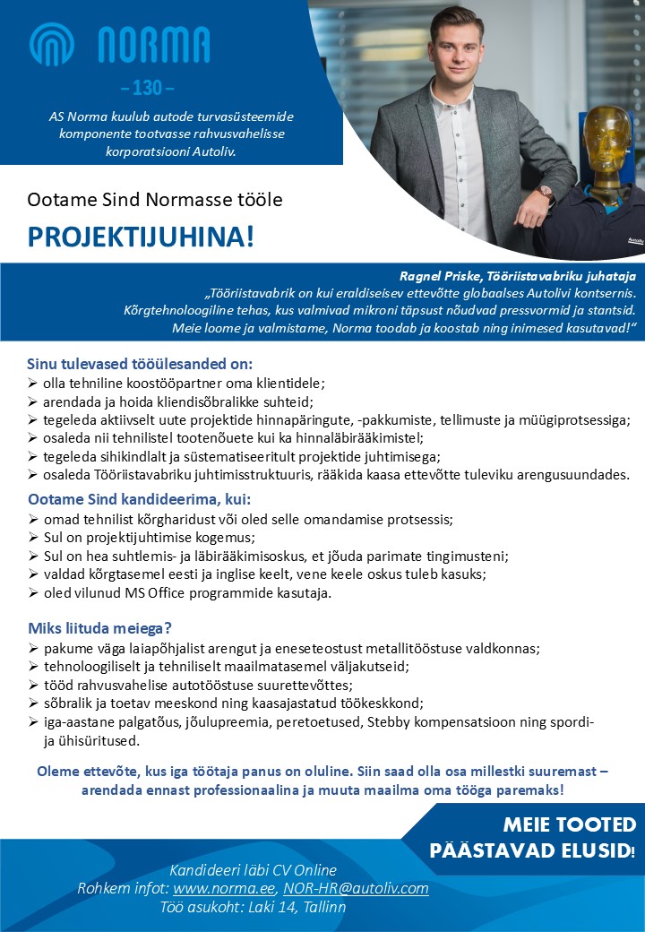 AS NORMA tegutseb alates 1891.aastast ja kuulub globaalsesse autoohutussüsteeme tootvasse kontserni Autoliv. Meie klient on rahvusvaheline autotööstus. Meie kaubaks on TURVALISUS ja USALDUS. 1973. aastal alustas Norma autode ohutusrihmade tootmist. Lisaks autode turvasüsteemide tootmisele ja müügile on tänasest Normast kujunenud arvestatav turvavarustuse komponentide valmistaja rahvusvahelisele autotööstusele. Meie klientide tarbeks kasutatavad tehnoloogiad on lehtmetalli järjestikstantsimine, sh. silelõikestantsimine, plastmasside survevalu, galvaaniline katmine ja erinevad koostamisoperatsioonid. Meie ettevõttes valmistatud tooted päästavad igal aastal rohkem kui 35 000 inimese elu.
