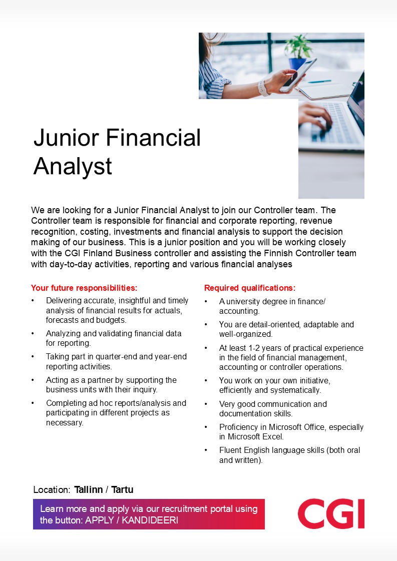 1976. aastal asutatud CGI on üks maailma suuremaid IT- ja ärinõustamisteenuste osutajaid. Tugineme pikaaegsele kogemusele, et aidata kiirendada koostööpartnerite investeeringute tasuvust. Eesti turul oleme tegutsenud üle 25 aasta ning meie Tallinna ja Tartu kontorites töötab tänaseks üle 180 inimese.CGI pakub enamat kui lihtsalt töökohta. Pakume võimalust olla osa meie klientide ärist, aidates neil ellu viia olulisi muudatusi. Kui Sulle on oluline töö kvaliteet, pühendunud kolleegid, Sind ümbritsev ühiskond ja põnevad väljakutsed liitu CGI-ga!