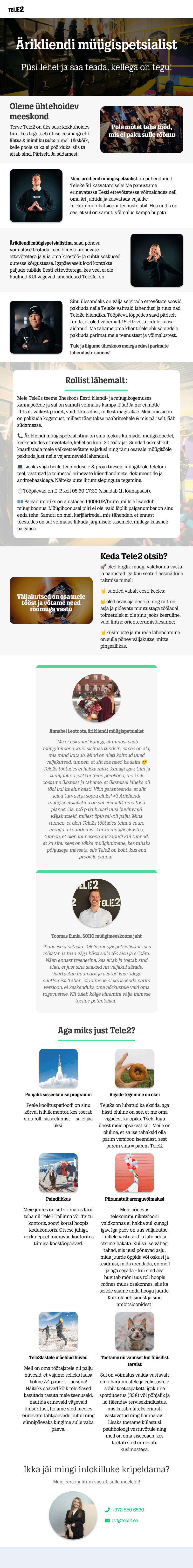Tele2 ei ole lihtsalt tööandja ja Tele2s ei käi sa lihtsalt tööl. Tele2ga asud sa seiklusele jõudes kohta, kus saad kõik oma karjäärialased unistused tegudeks pöörata! Selleks tuleks sul aga unustada igasugused mõtted bürokraatiast ja korporatiivsetest rollidest. Me oleme elujõudu täis ja agiilsed oma tegemistes. Just selliseid inimesi me oma tiimidesse ootame.