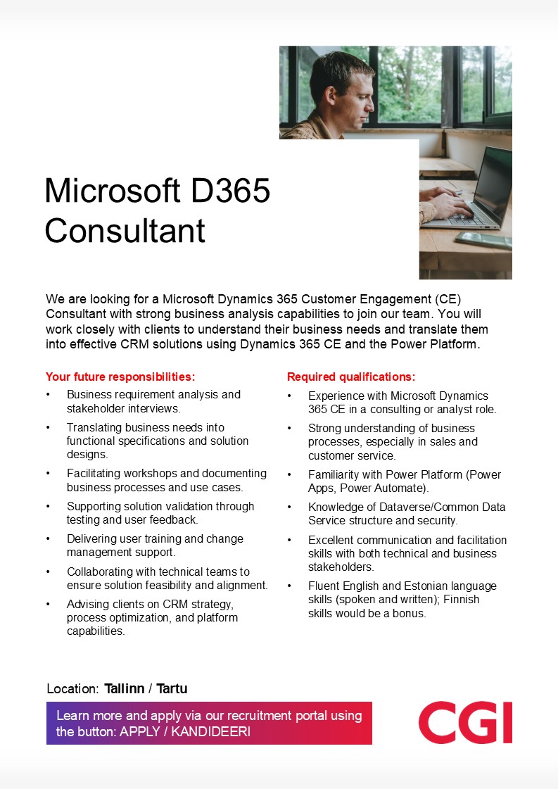 CGI pakub enamat kui lihtsalt töökohta. Pakume võimalust olla osa meie klientide ärist, aidates neil ellu viia olulisi muudatusi. Kui Sulle on oluline töö kvaliteet, pühendunud kolleegid, Sind ümbritsev ühiskond ja põnevad väljakutsed liitu CGI-ga!