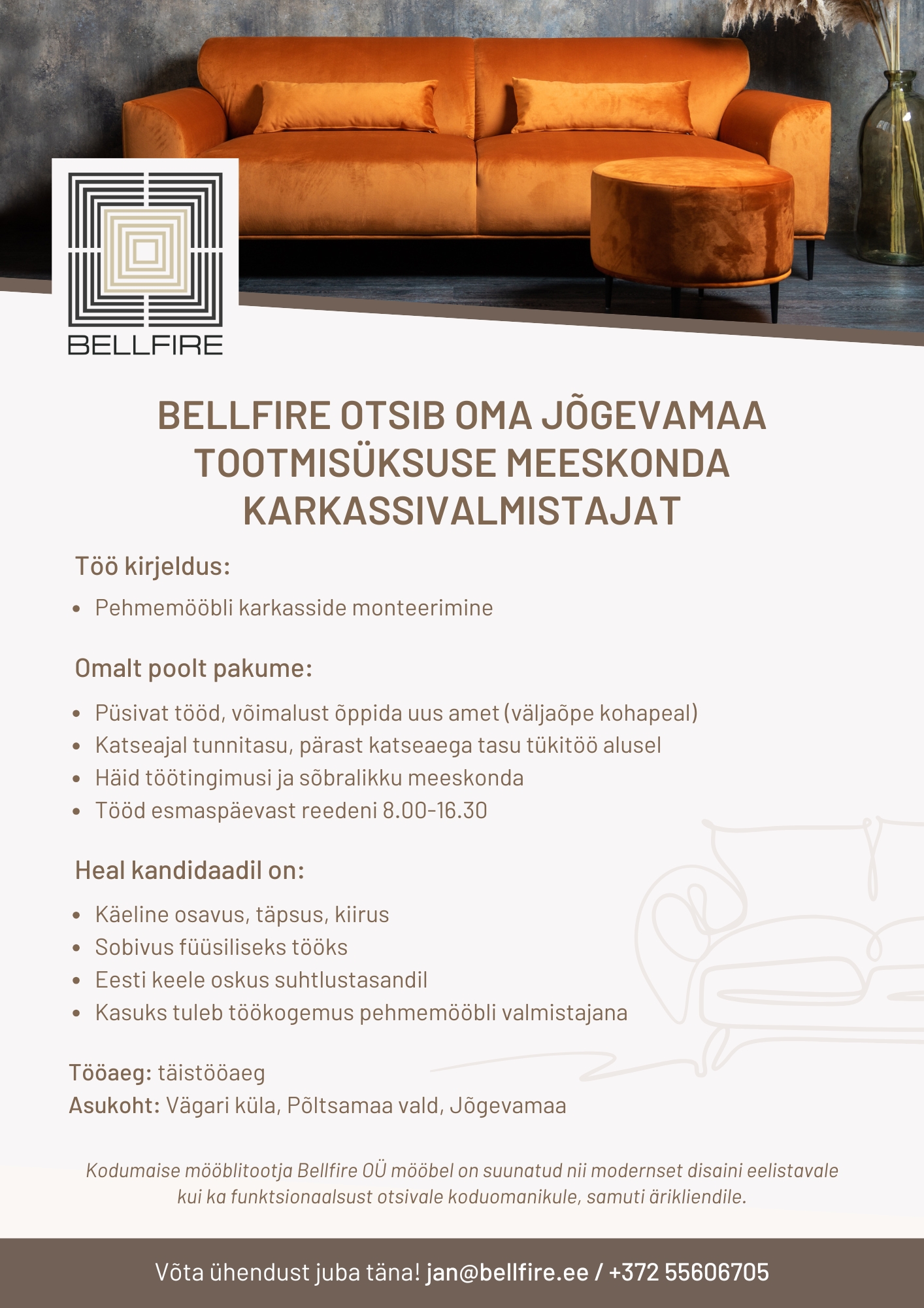 Kodumaise mööblitootja Bellfire OÜ mööbel on suunatud nii modernset disaini eelistavale kui ka funktsionaalsust otsivale koduomanikule, samuti ärikliendile.