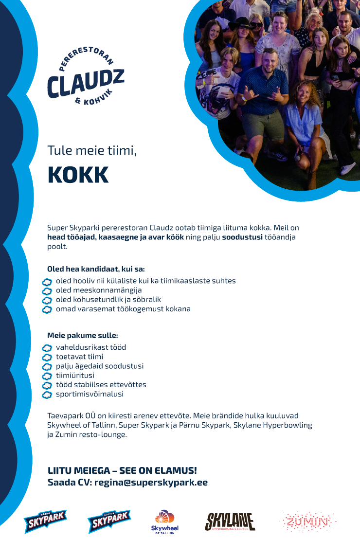 Super Skyparki pererestoran Claudz ootab tiimiga liituma kokka. Meil on head tööajad, kaasaegne ja avar köök ning palju soodustusi tööandja poolt.