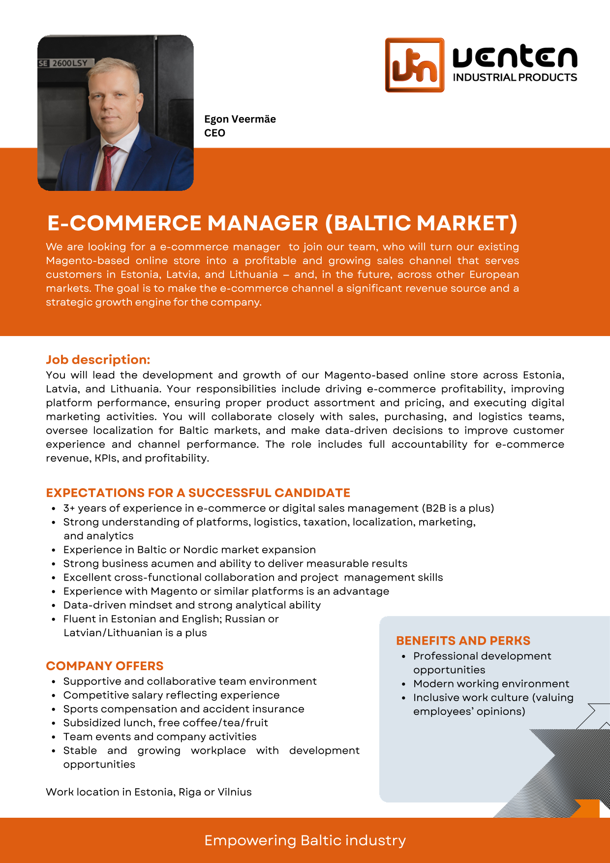 - Vähemalt 3+ aastat kogemust e-kaubanduse või digimüügi juhtimises, eelistatult B2B või tööstussektoris.