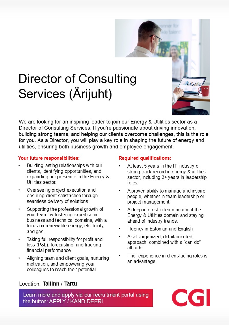 1976. aastal asutatud CGI on üks maailma suuremaid IT- ja ärinõustamisteenuste osutajaid. Tugineme pikaaegsele kogemusele, et aidata kiirendada koostööpartnerite investeeringute tasuvust. Eesti turul oleme tegutsenud üle 25 aasta ning meie Tallinna ja Tartu kontorites töötab tänaseks üle 180 inimese.