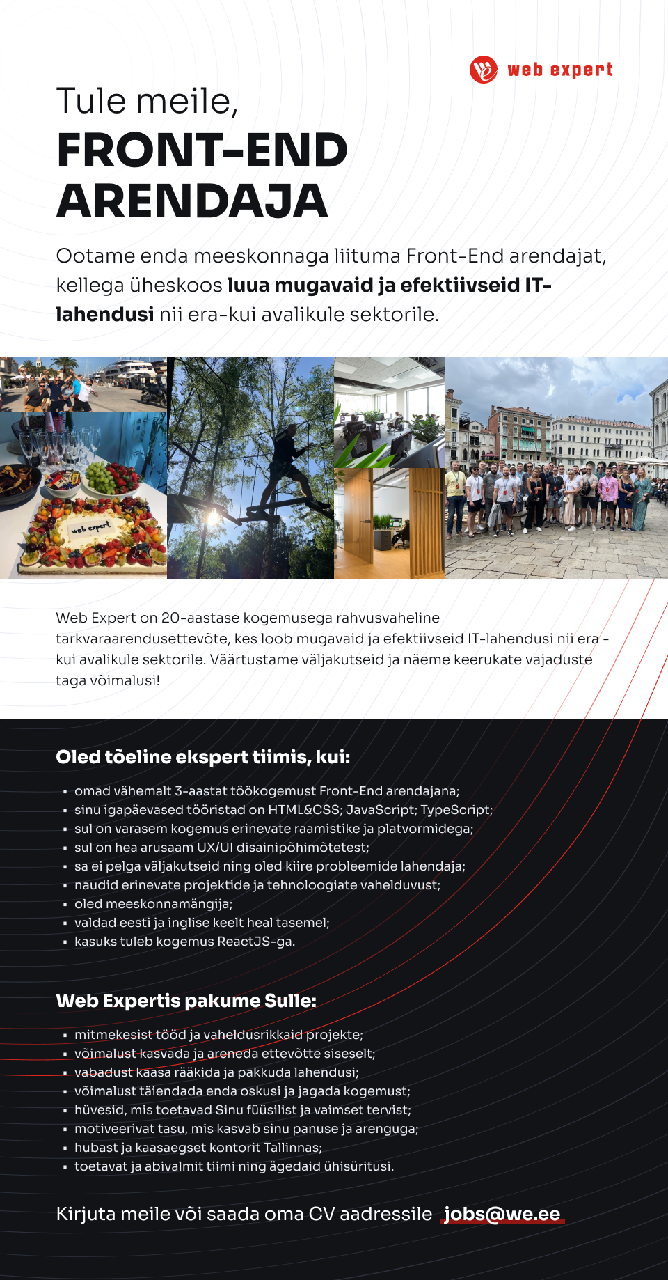 20-aastase kogemusega uuendusmeelne tarkvaraarendusettevõte, mille eesmärgiks on luua mugavaid ja efektiivseid IT-lahendusi nii era- kui avalikule sektorile. Väärtustame väljakutseid ja näeme keerukate vajaduste taga võimalusi.
